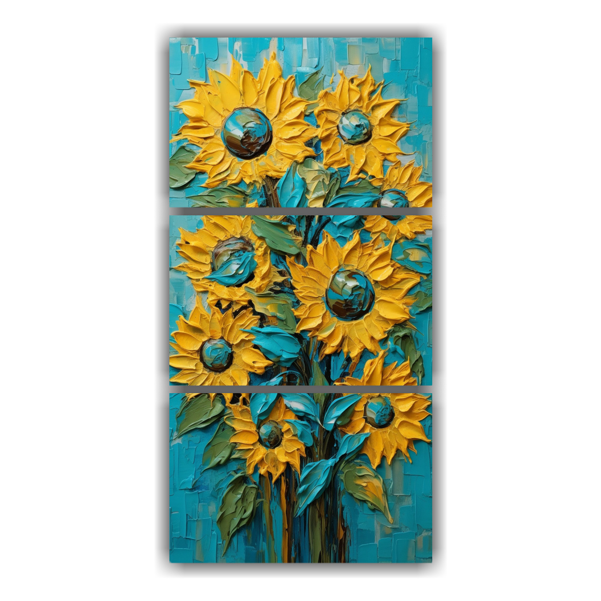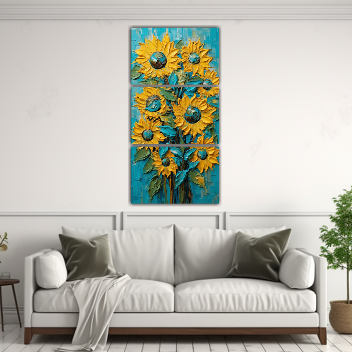 Para lograr un ambiente armonioso, coloca el cuadro de girasoles turquesa en lienzo en tu sala de estar junto a muebles blancos y detalles dorados Combínalo con cojines en tonos turquesa y dorado para resaltar la belleza de la pintura ¡Crea un espacio sofisticado y acogedor con esta obra de arte exclusiva!