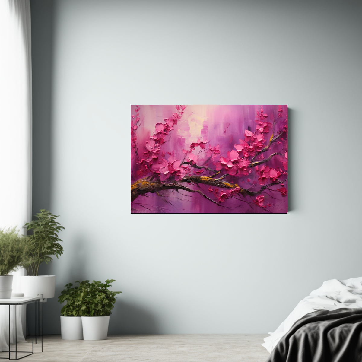 Este cuadro se vería espectacular en una pared blanca o en tonos claros para resaltar su belleza y elegancia Puedes combinarlo con muebles de colores neutros o incluso con detalles en los tonos presentes en la obra, creando así un ambiente armonioso y lleno de vida