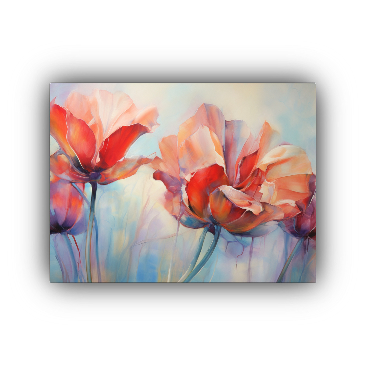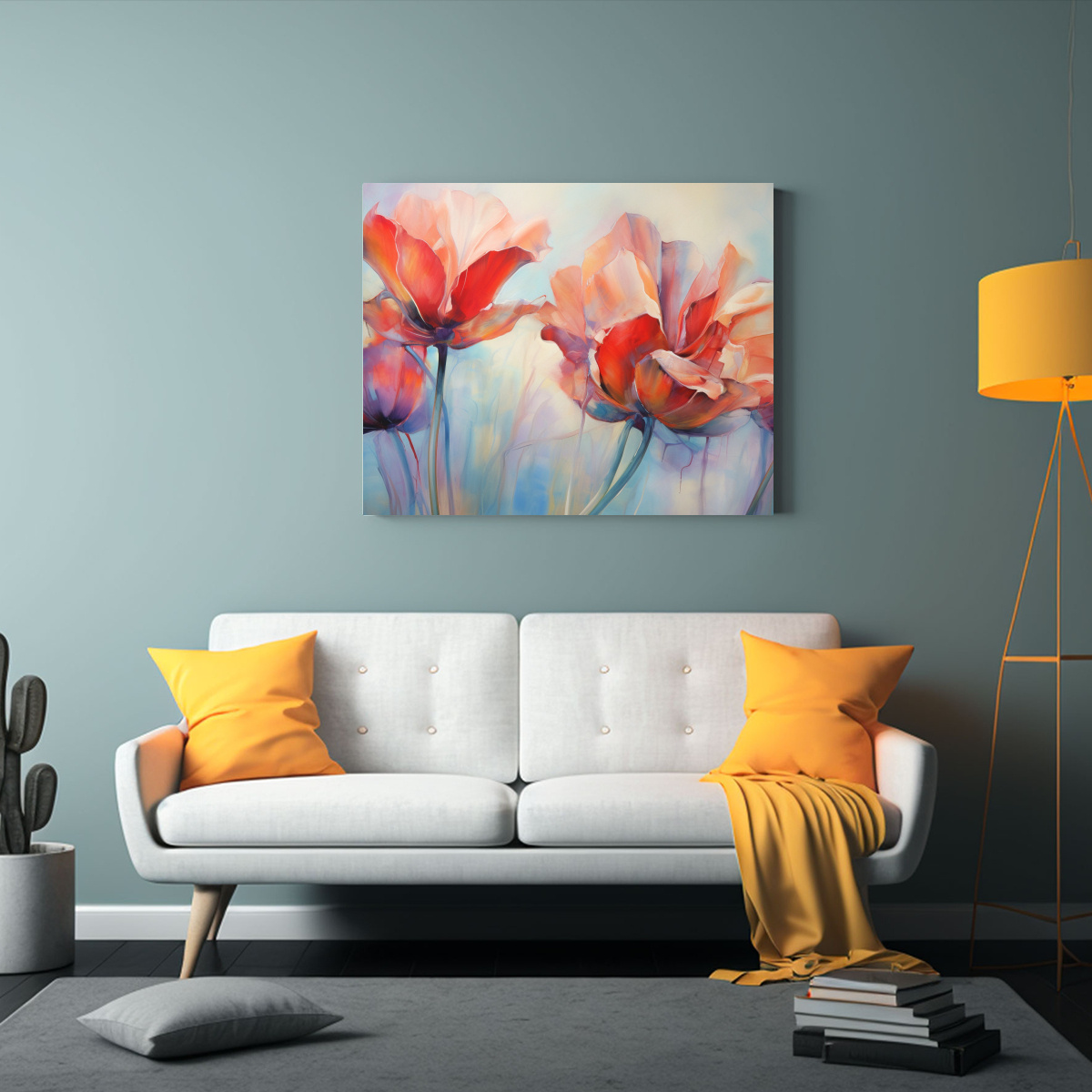 Este hermoso cuadro de tulipanes en tonos plateado, azul y gris es perfecto para decorar tu sala de estar o dormitorio Combínalo con muebles en tonos neutros y algunos cojines en colores coral y lila para lograr una atmósfera elegante y moderna