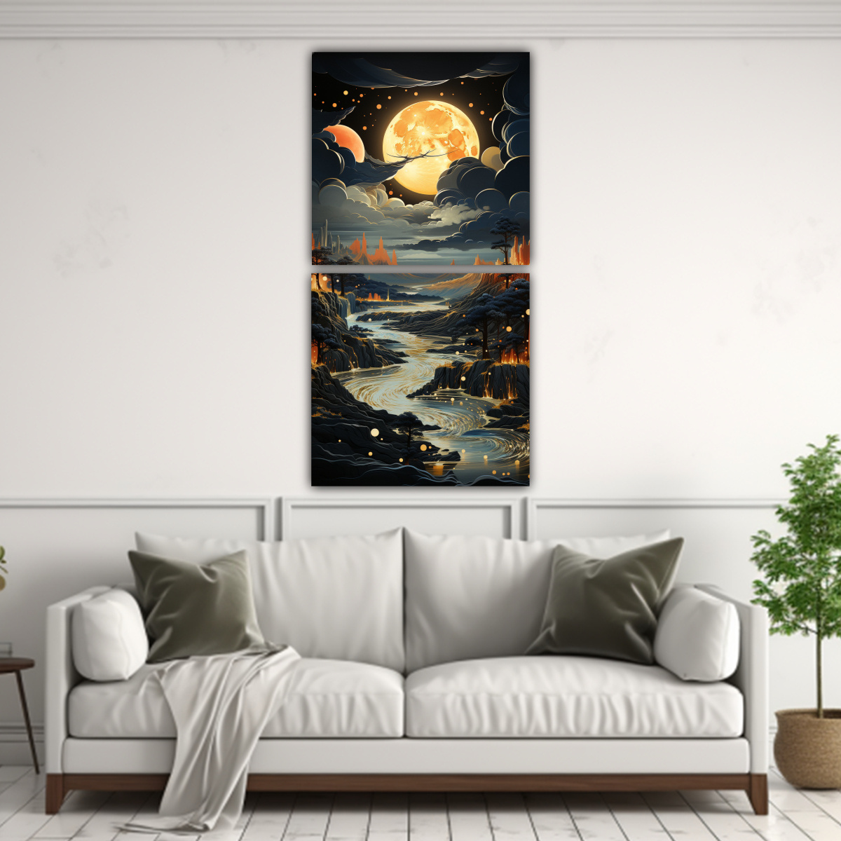Cuadro Minimalista Montaña Fases Lunares Paisaje Dorado
