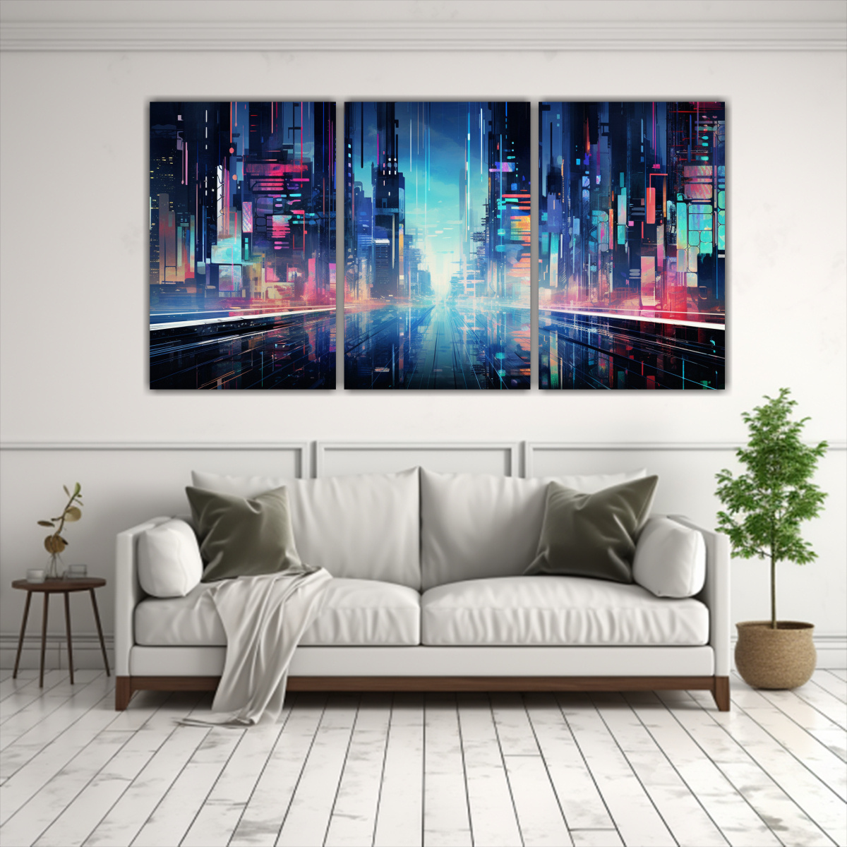 DecoCuadros ofrece cuadros modernos abstractos de una ciudad cibernética en colores plata, turquesa y negro Impresos en tela de alta calidad con bastidores de madera Envíos rápidos y gratuitos en Santiago, y envíos a regiones express