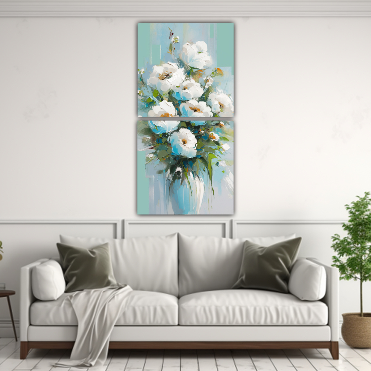 Cuadro Moderno Adorable Con Flores Blancas Y Turquesas En Lienzo I.