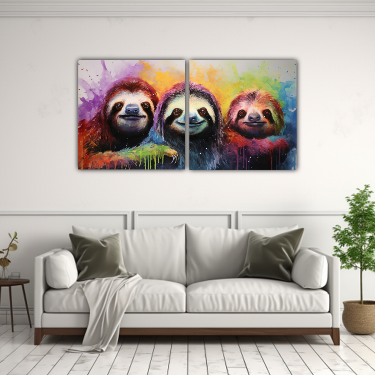 Cuadro Moderno De Dos Telas Con Composición De Perezosos En Estilo Pintura Al Estilo óleo Colorida