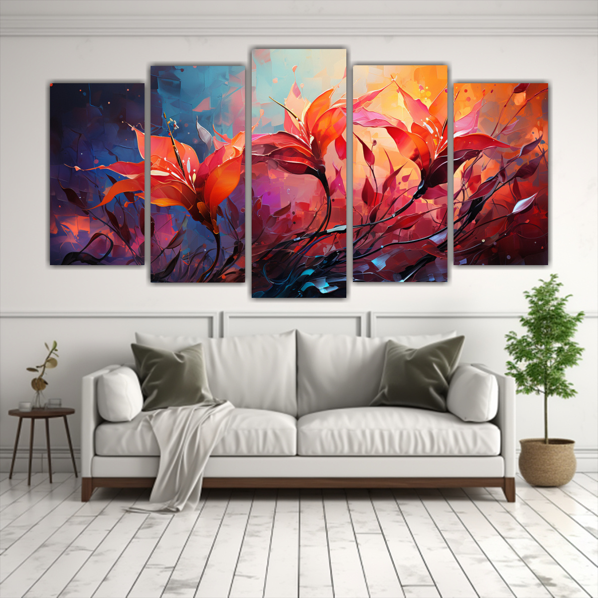 Una idea para decorar con el Cuadro Moderno de Lienzo Heliconia Leaves en Rojo es colocarlo en la pared principal de tu sala de estar, acompañado de muebles en tonos neutros como gris y blanco Esto creará un contraste impactante y resaltará los colores vibrantes del cuadro También puedes combinarlo con cojines y cortinas en tonos a juego para lograr una armonía visual en toda la habitación