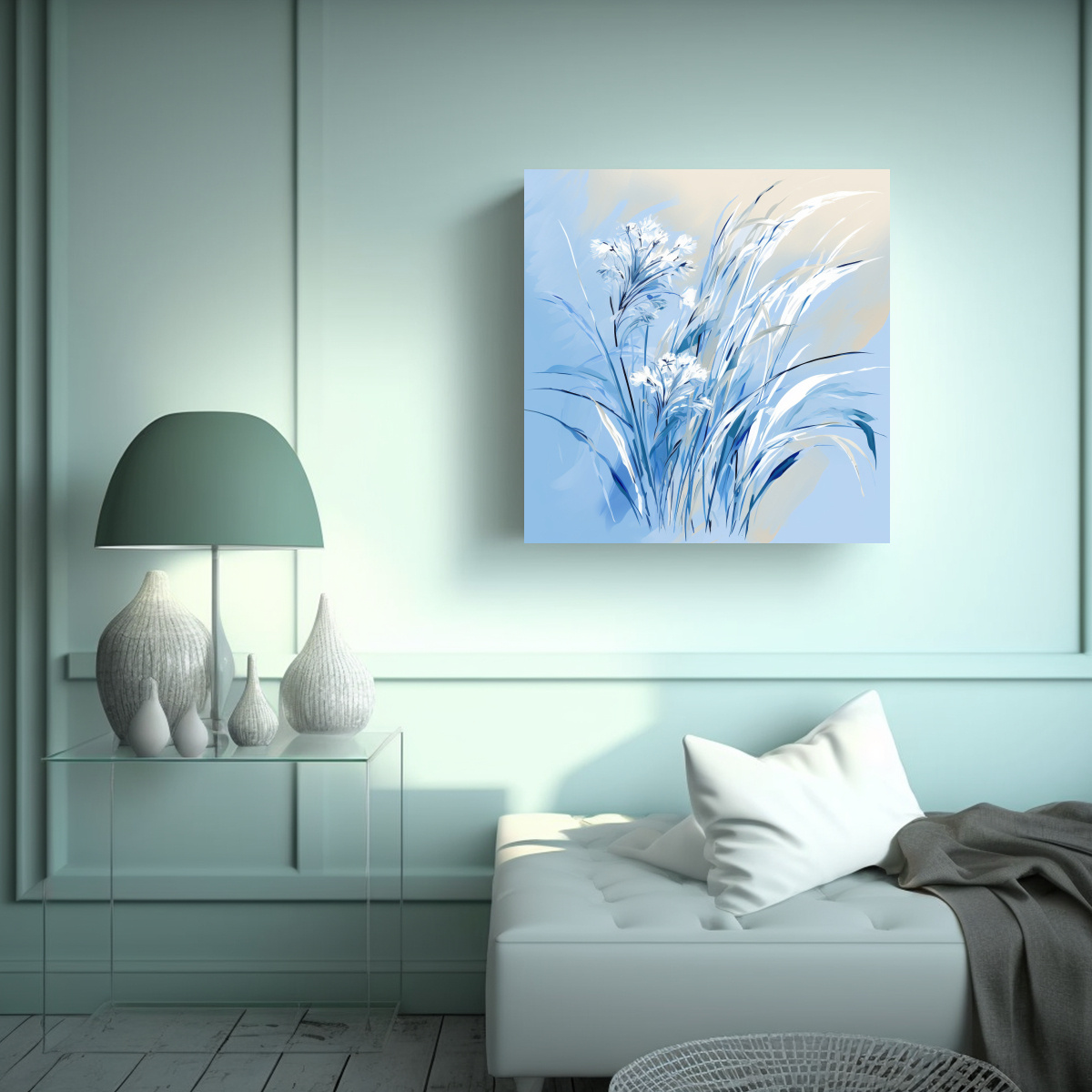 Decora tu espacio con el Cuadro Moderno de Madera Aromática en Colores Blanco y Azul con Hierbas de Lemongrass Ambiente Neonoir Su combinación de verde azulado, plateado, beige, turquesa y gris creará un ambiente neo-noir elegante y sofisticado Con materiales de alta calidad y diseño exclusivo, este cuadro es perfecto para cualquier habitación