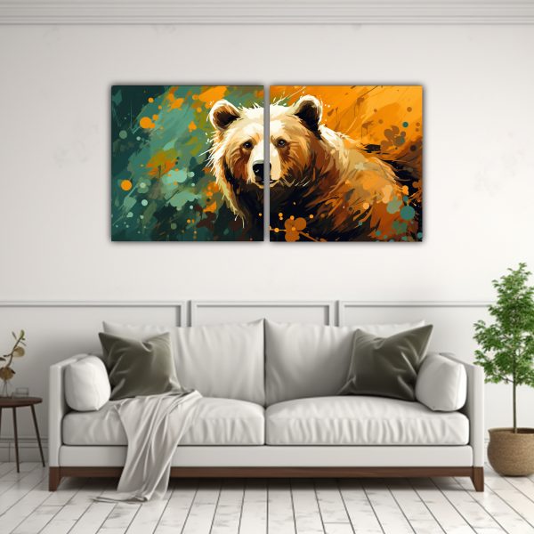 Coloca este cuadro neo pop art en colores oso y bosque en el centro de tu sala de estar para crear un punto focal impactante Combínalo con muebles en tonos neutros y accesorios en colores mostaza o azul marino para lograr una decoración moderna y sofisticada