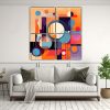Este cuadro moderno surrealista con formas orgánicas y geométricas sería perfecto para decorar una sala de estar minimalista Colócalo sobre un sofá de color blanco o gris claro, y combínalo con cojines en tonos azul marino y coral Añade una alfombra beige o gris, y algunos accesorios decorativos en color turquesa y amarillo claro De esta manera, lograrás crear un ambiente armonioso y sofisticado en tu sala de estar