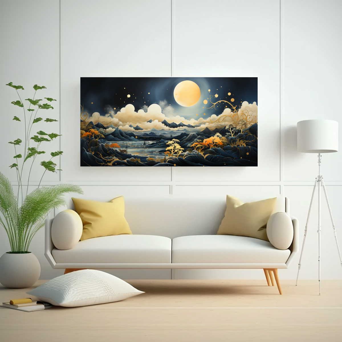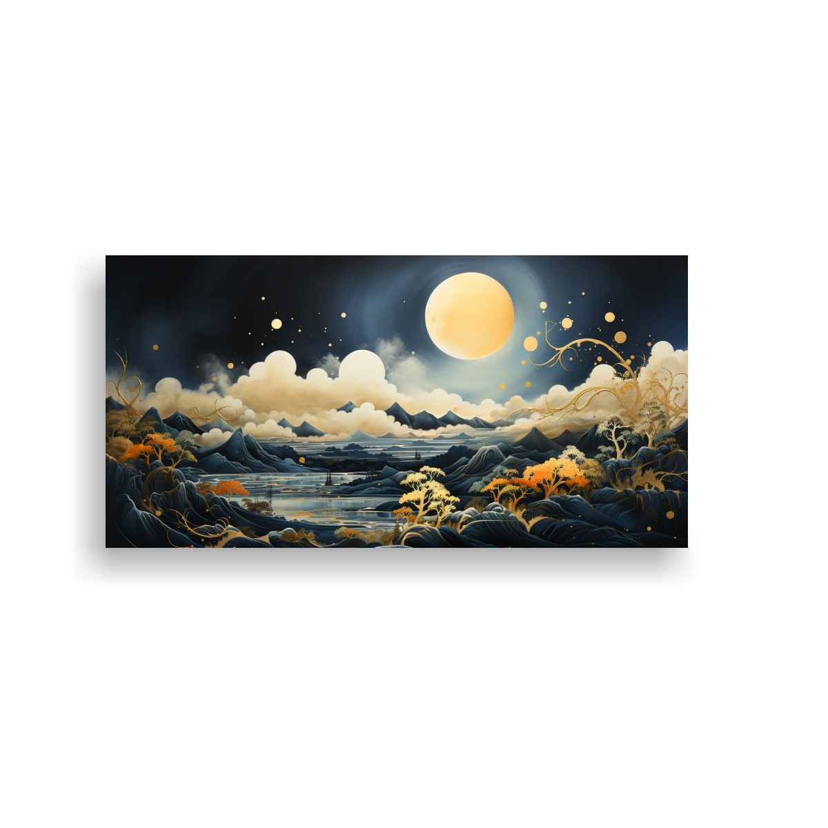 Descubre el cuadro Montaña Luna Paisaje Nocturno de DecoCuadros, con colores grisáceos, dorado y mostaza Impreso en tela de alta calidad y montado en un bastidor de madera
