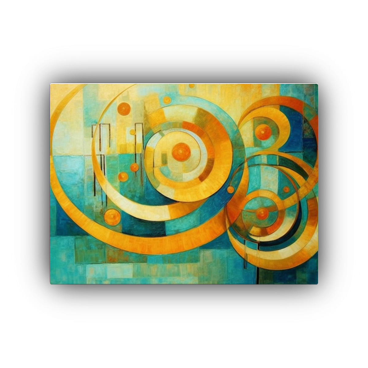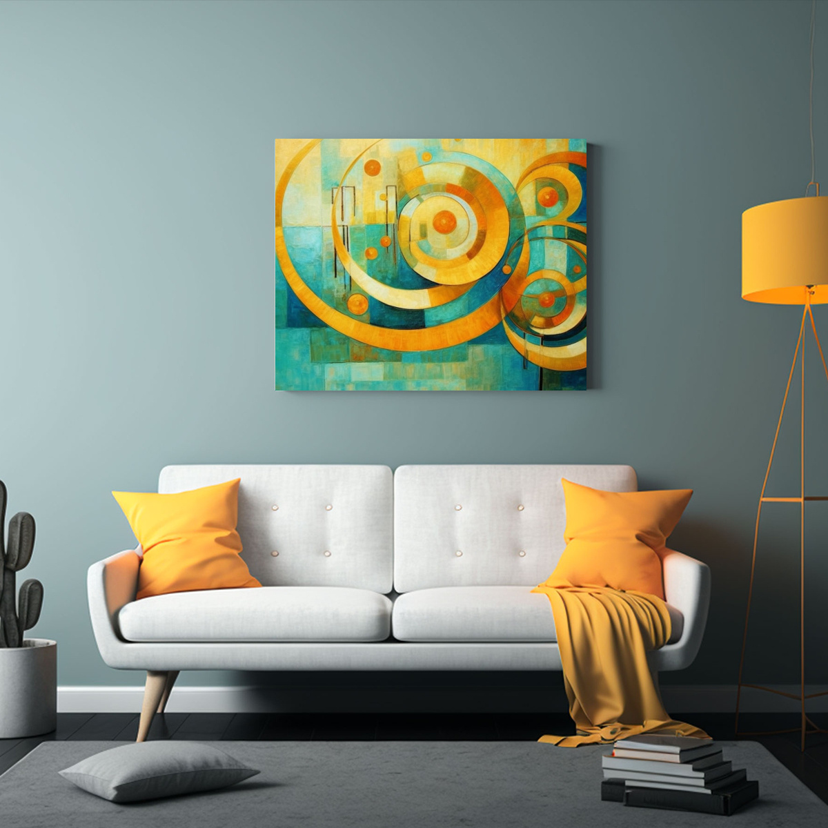 Este cuadro estilo Kandinsky con espirales doradas quedará espectacular en tu sala de estar sobre un sofá de color neutro, resaltando sus tonos y agregando un toque de sofisticación Combínalo con cojines en tonos plateados y azul marino grisáceo para crear un ambiente armonioso y elegante
