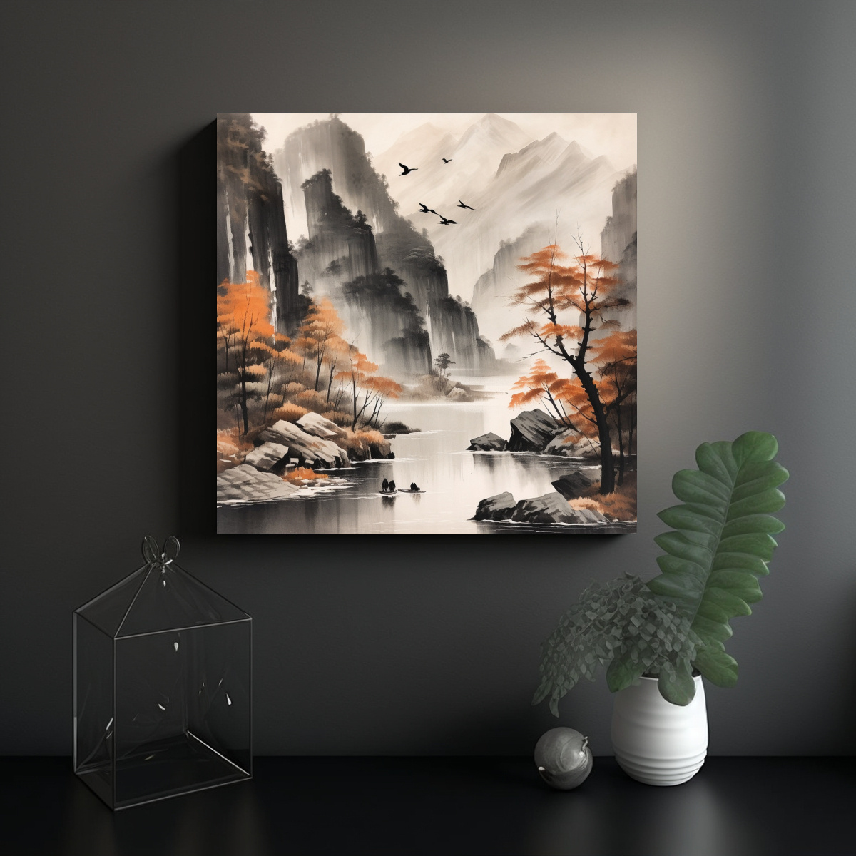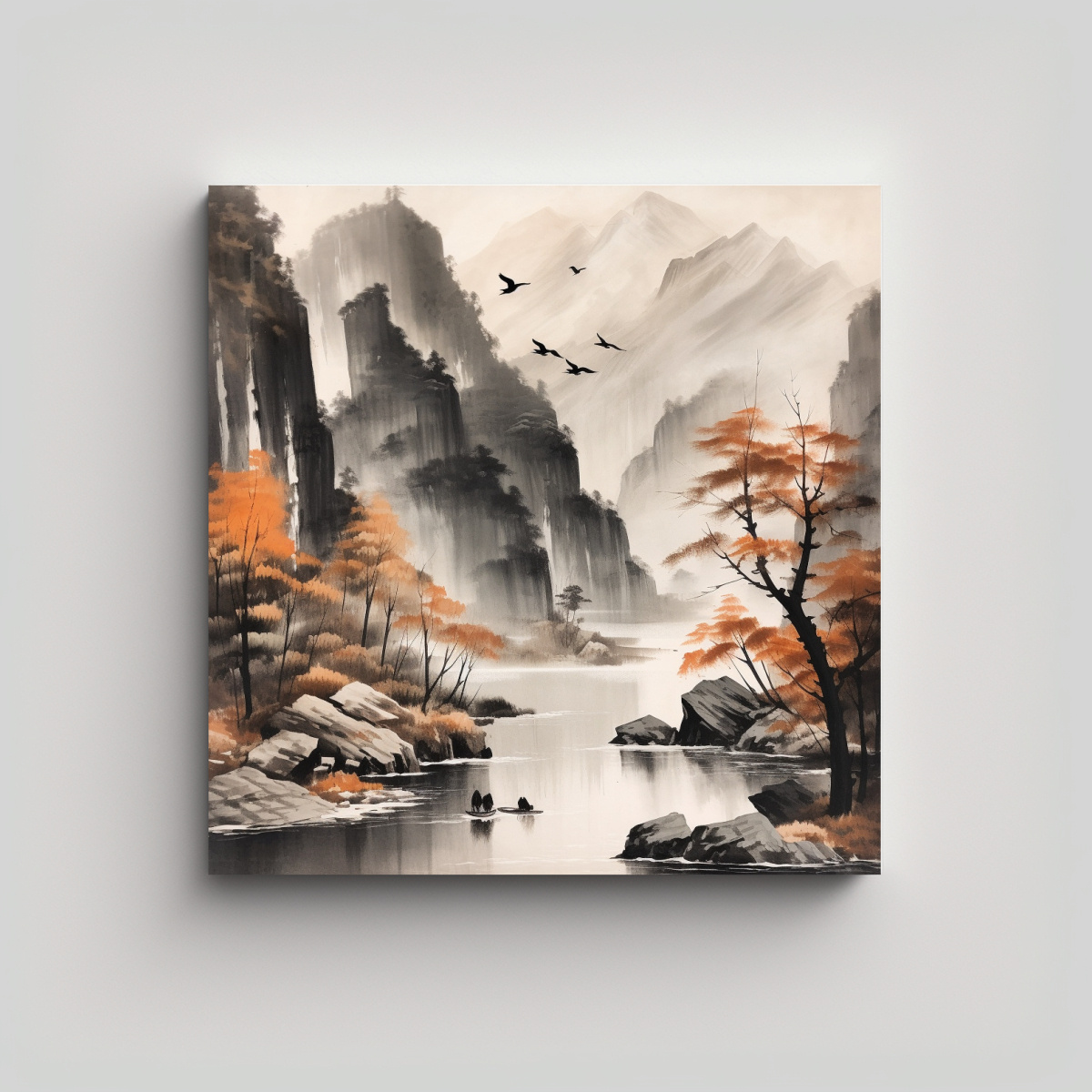 Aporta un toque de naturaleza y serenidad a tu espacio con este hermoso cuadro Las montañas, cascada, lago, barca y aves en tonos otoñales crearán un ambiente acogedor y elegante Calidad garantizada al mejor precio del mercado