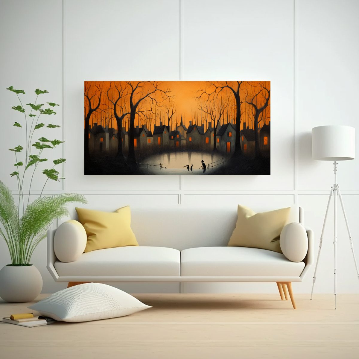Coloca este cuadro paisajístico en la sala de estar para crear un ambiente acogedor y relajante Combínalo con cojines en tonos mostaza, gris y negro para resaltar los colores de la obra y lograr una decoración armoniosa
