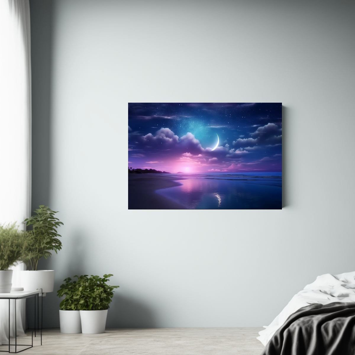 Este cuadro se vería perfecto en el dormitorio, sobre la cabecera de la cama, creando un ambiente relajante y soñador Combínalo con tonos suaves en la ropa de cama y detalles en violeta para una decoración armoniosa y elegante