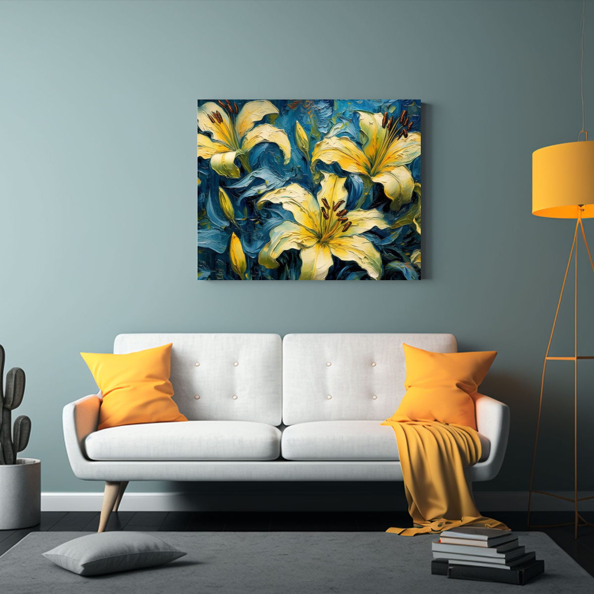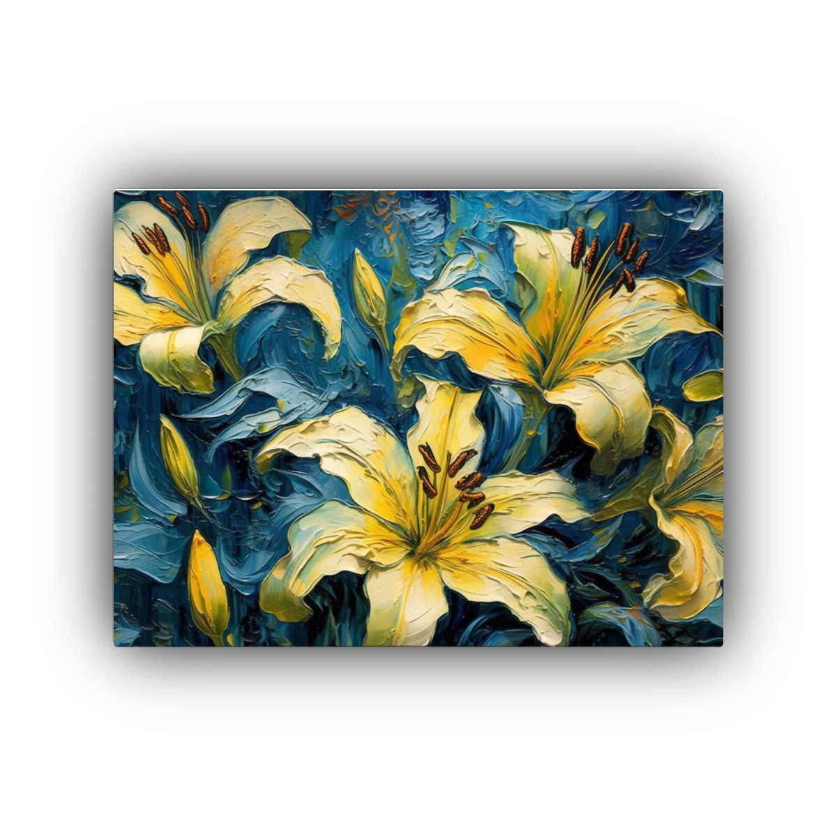 El Cuadro Patron Intenso de Lirios Amarillos sobre Fondo Azul Alto Contraste 16K de DecoCuadros es la opción perfecta para darle vida y estilo a tus espacios Con una impresión de alta definición sobre tela de calidad premium, este cuadro brinda un impacto visual único y colores intensos que resaltarán en cualquier pared El diseño exclusivo de nuestra tienda y la amplia gama de tamaños disponibles te permitirán encontrar la opción perfecta para complementar tu decoración