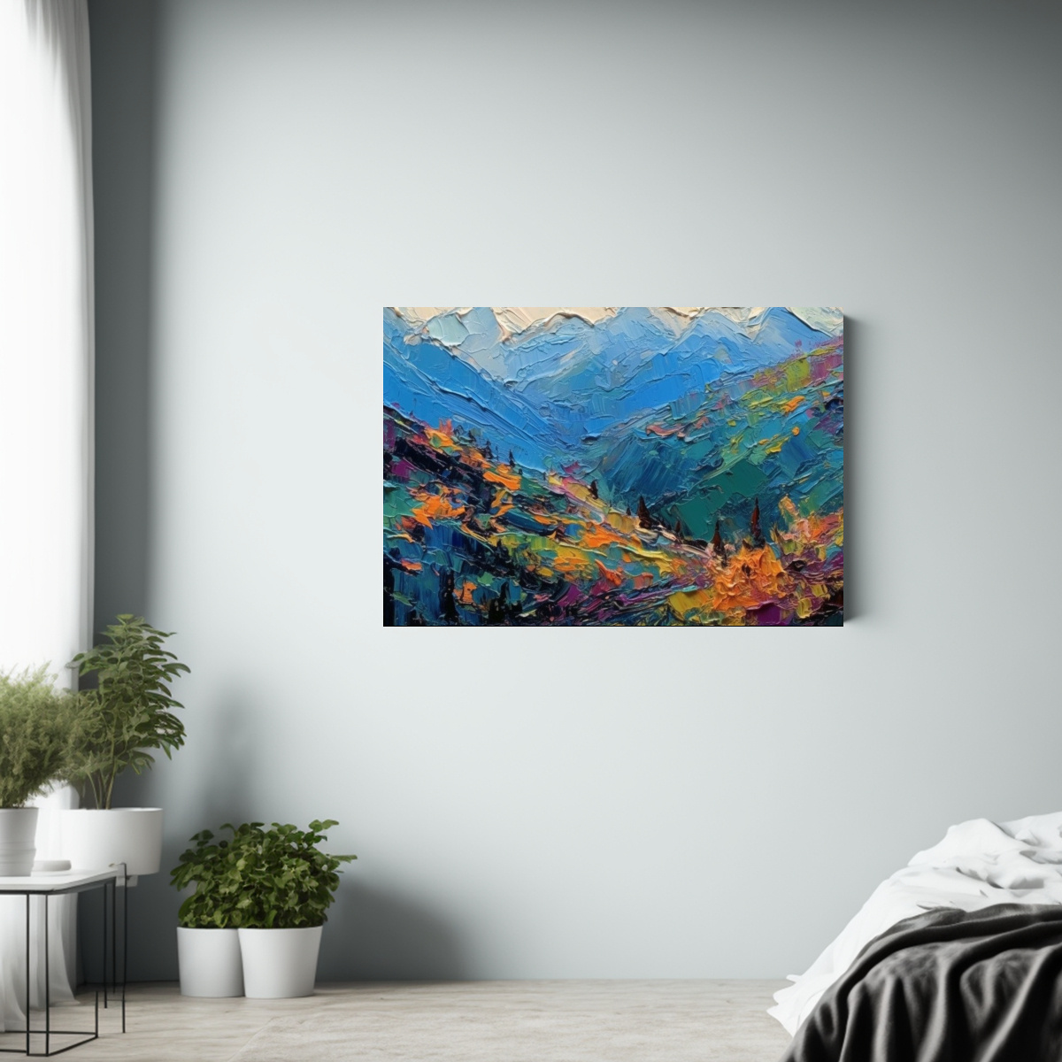Este cuadro es ideal para colocarse en la sala de estar sobre un sofá de color neutro, aportando un toque de frescura y elegancia Combínalo con cojines en tonos azules y verdes para lograr una armonía perfecta en tu espacio