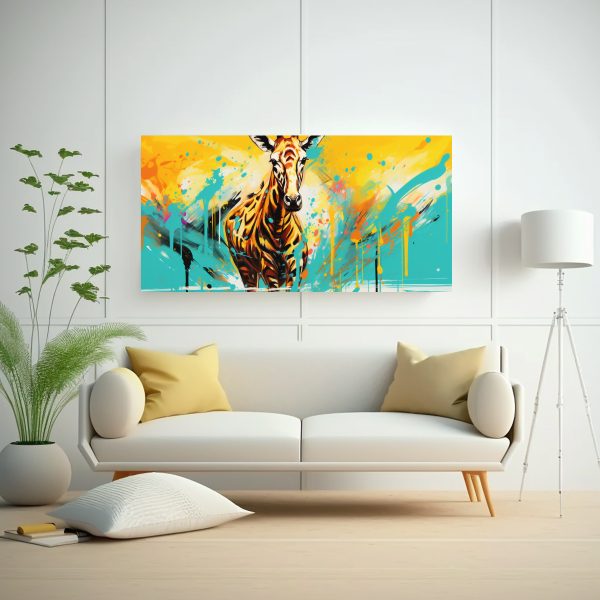 Este llamativo cuadro de Safari en Amarillo y Turquesa sería perfecto para decorar una sala de estar o un estudio Combínalo con muebles en tonos neutros para que resalte y añada un toque moderno y vibrante a la habitación