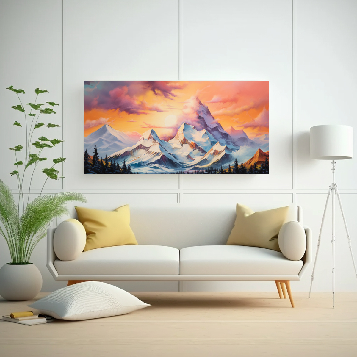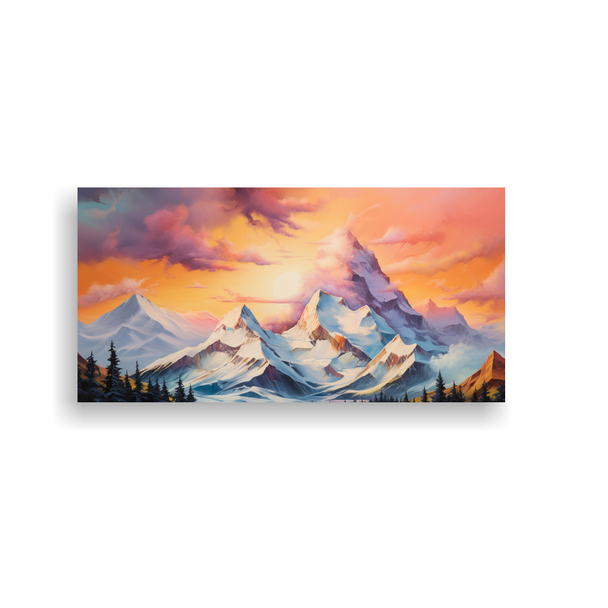 Dale a tu hogar un toque único con este cuadro pop art que representa montañas nevadas con un arcoíris en tonos naranja Diseño exclusivo y entrega express ¡Decora con estilo y originalidad!