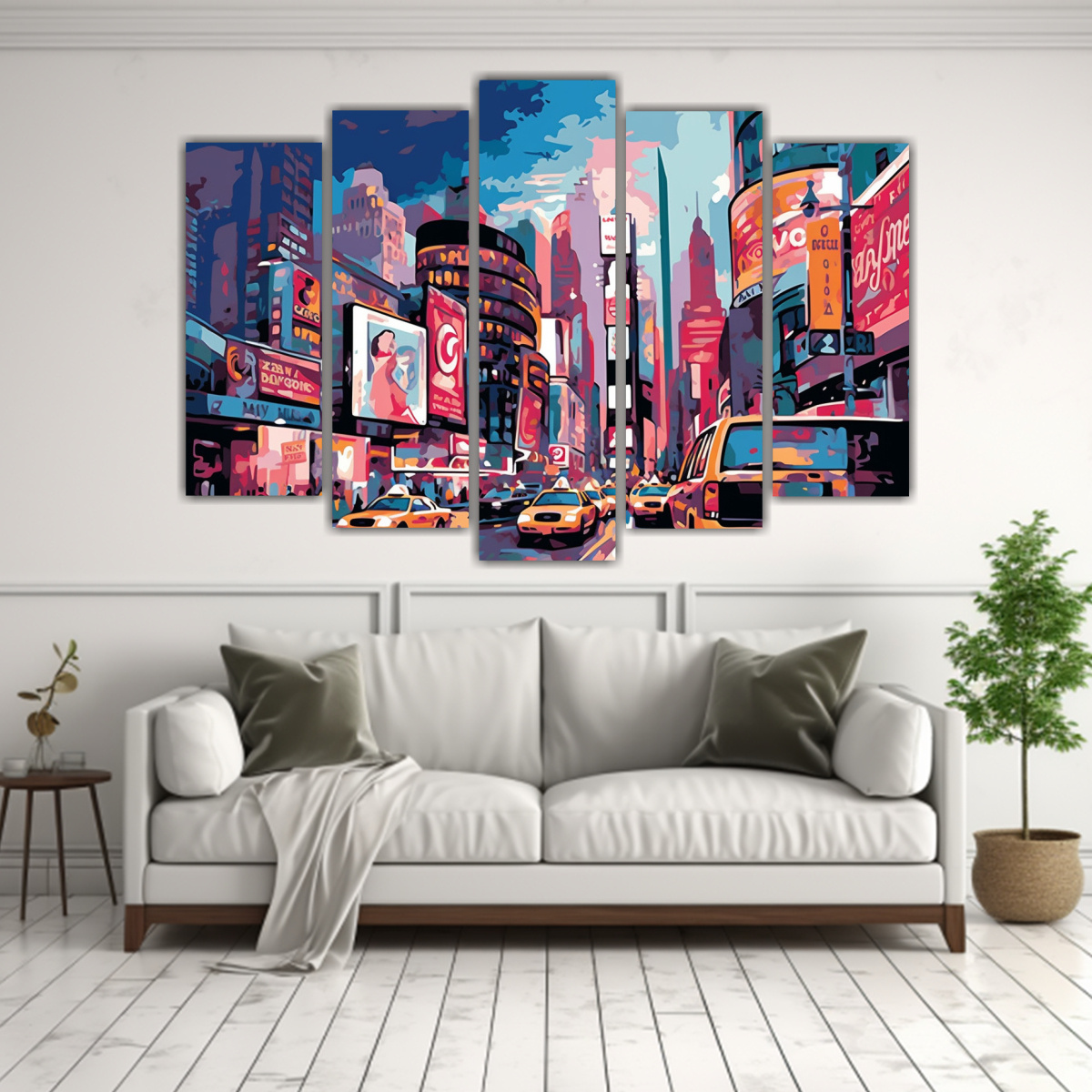 Este cuadro de Nueva York con tonos intensos y llamativos sería ideal para decorar el salón principal de tu hogar Combínalo con muebles en tonos neutros y accesorios en colores que resalten, como cojines en coral o mantas en turquesa, para lograr un ambiente sofisticado y moderno