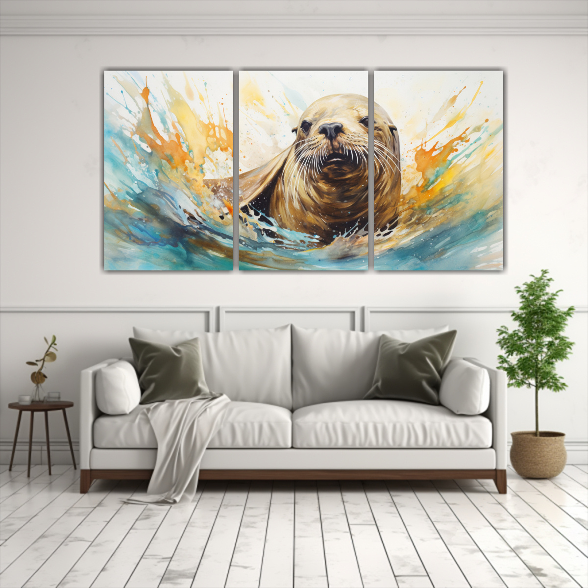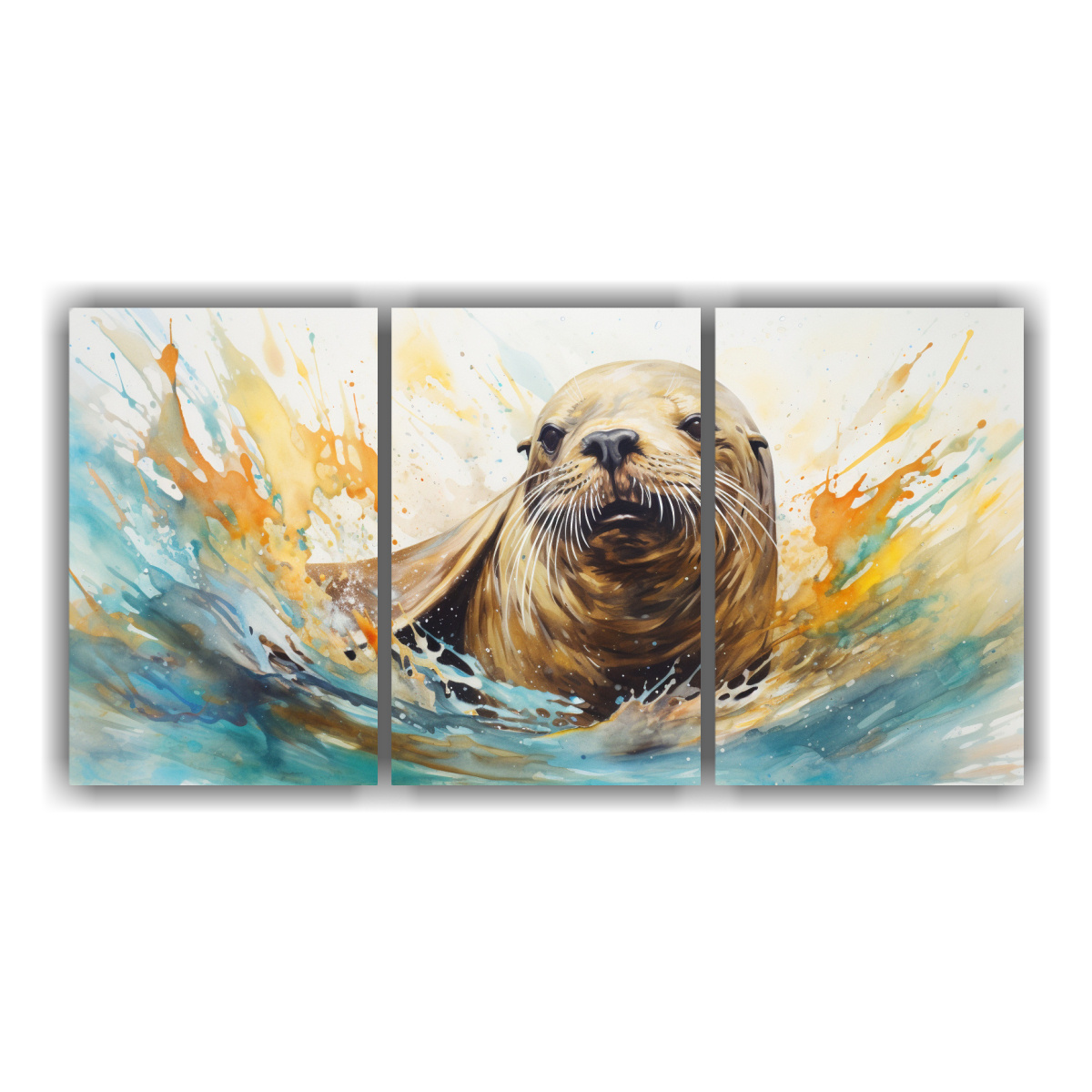 Cuadro Sea Lion Arte Acuarela Colorido En Tela Canvas, Set 3.