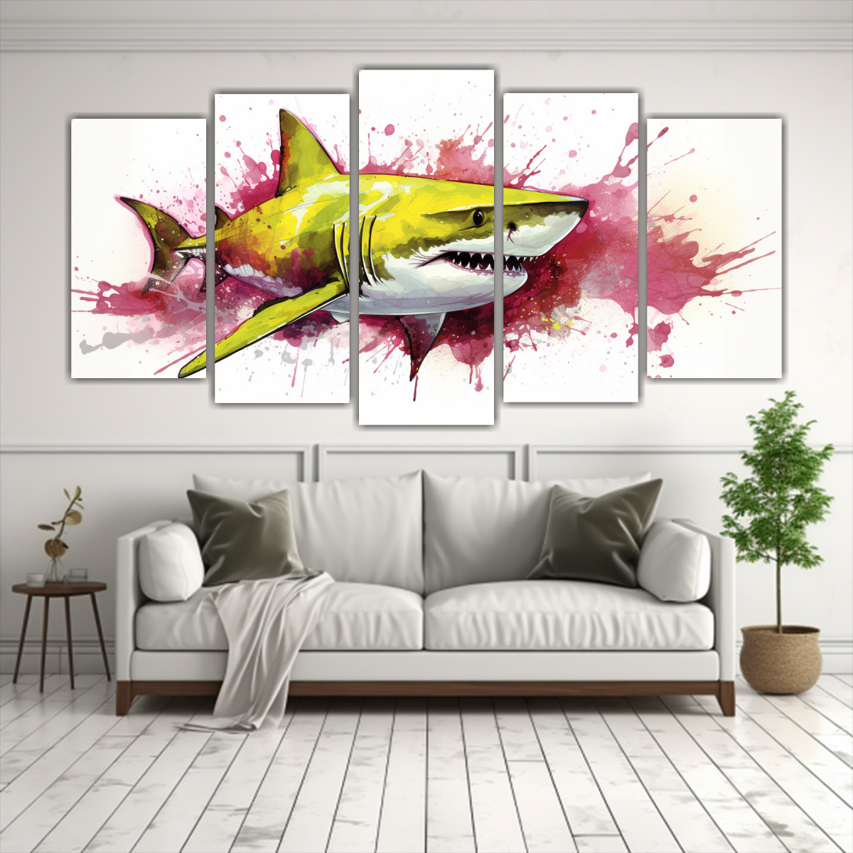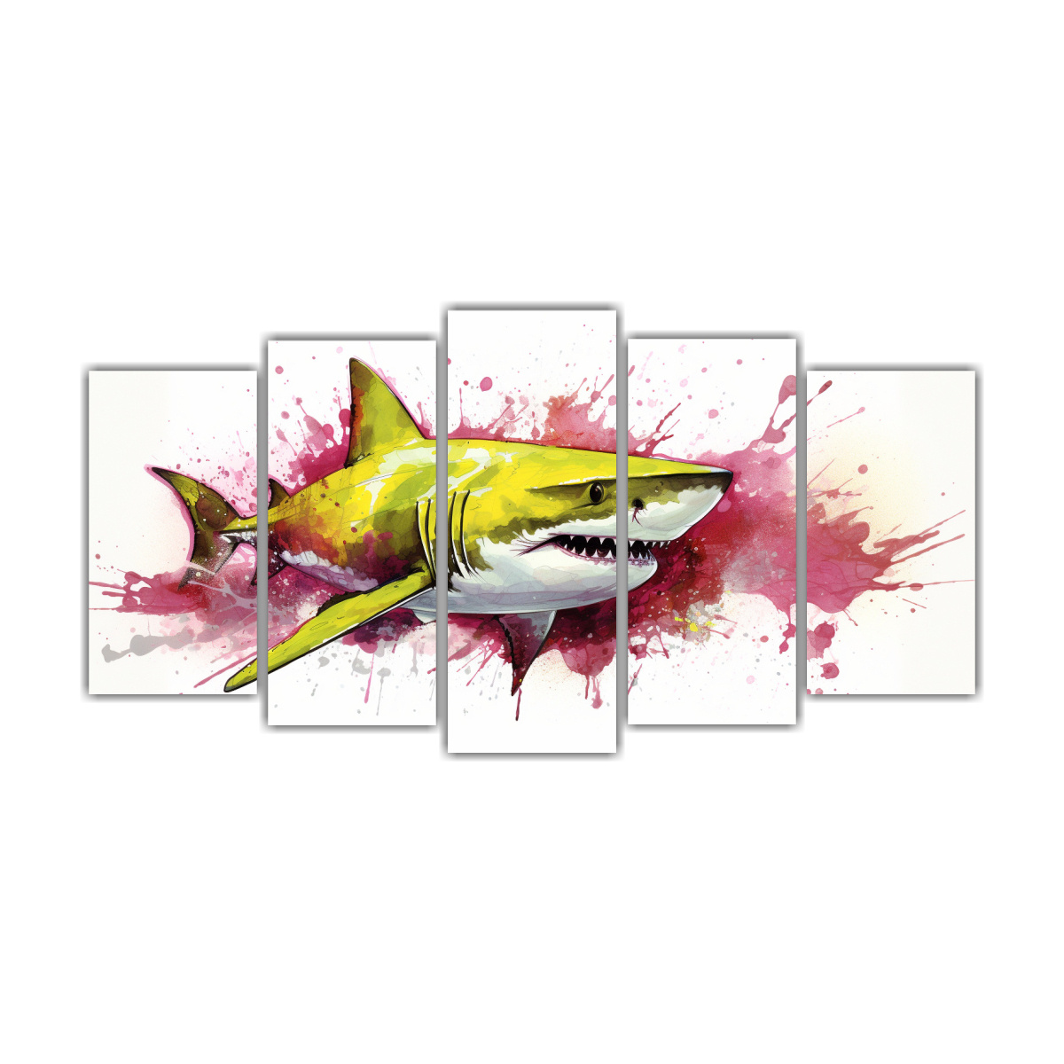 Transforma tu espacio con este cuadro de tela neo pop Destaca la fuerza del tiburón toro en tonos vibrantes para darle vida a tu ambiente Atrévete a colocarlo en la sala para un impacto visual poderoso y moderno