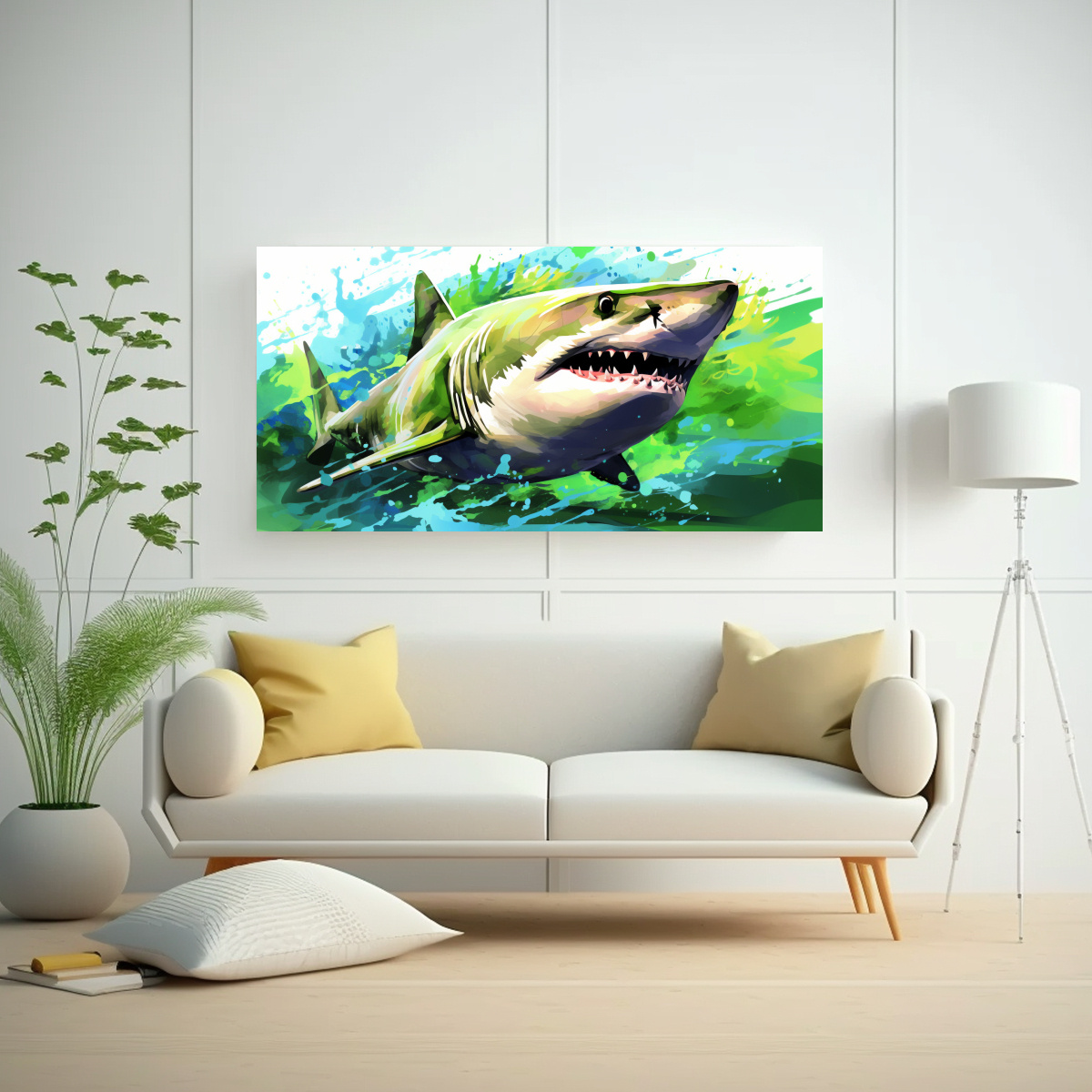 Cuadro Tela Bastidor Calidad Económico Tiburón Tigre Arena En Colores Brillantes Y Verdes Neo.po
