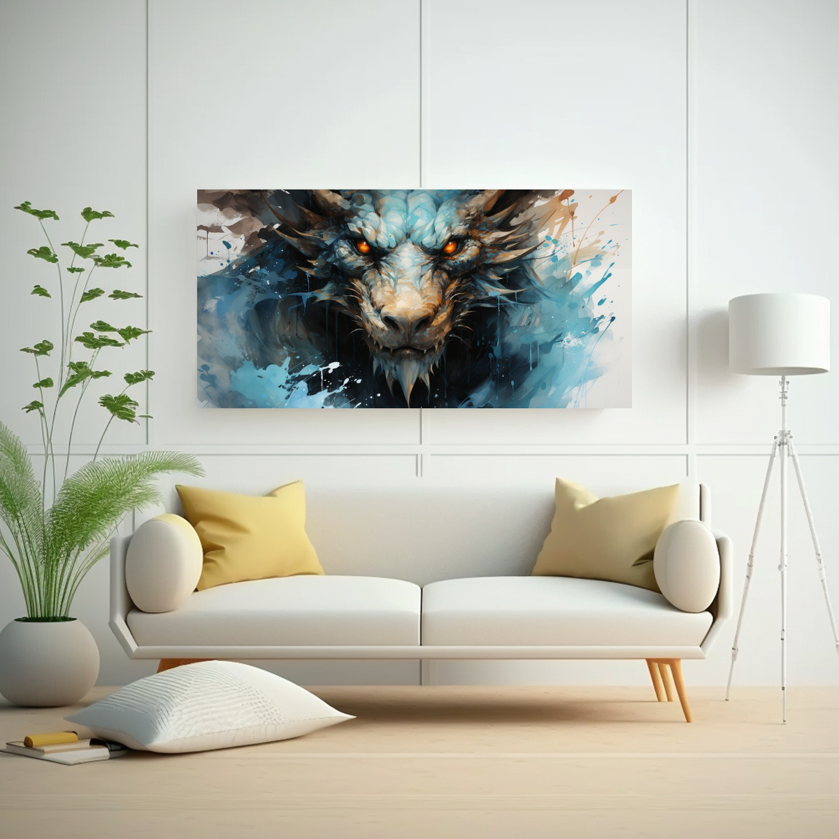 Para resaltar la belleza del Cuadro tela vintage dragón acuarela y turquesa, colócalo en una pared de tonos neutros como blanco o gris claro Complementa con muebles en tonos turquesa o coral para crear un ambiente sofisticado y moderno