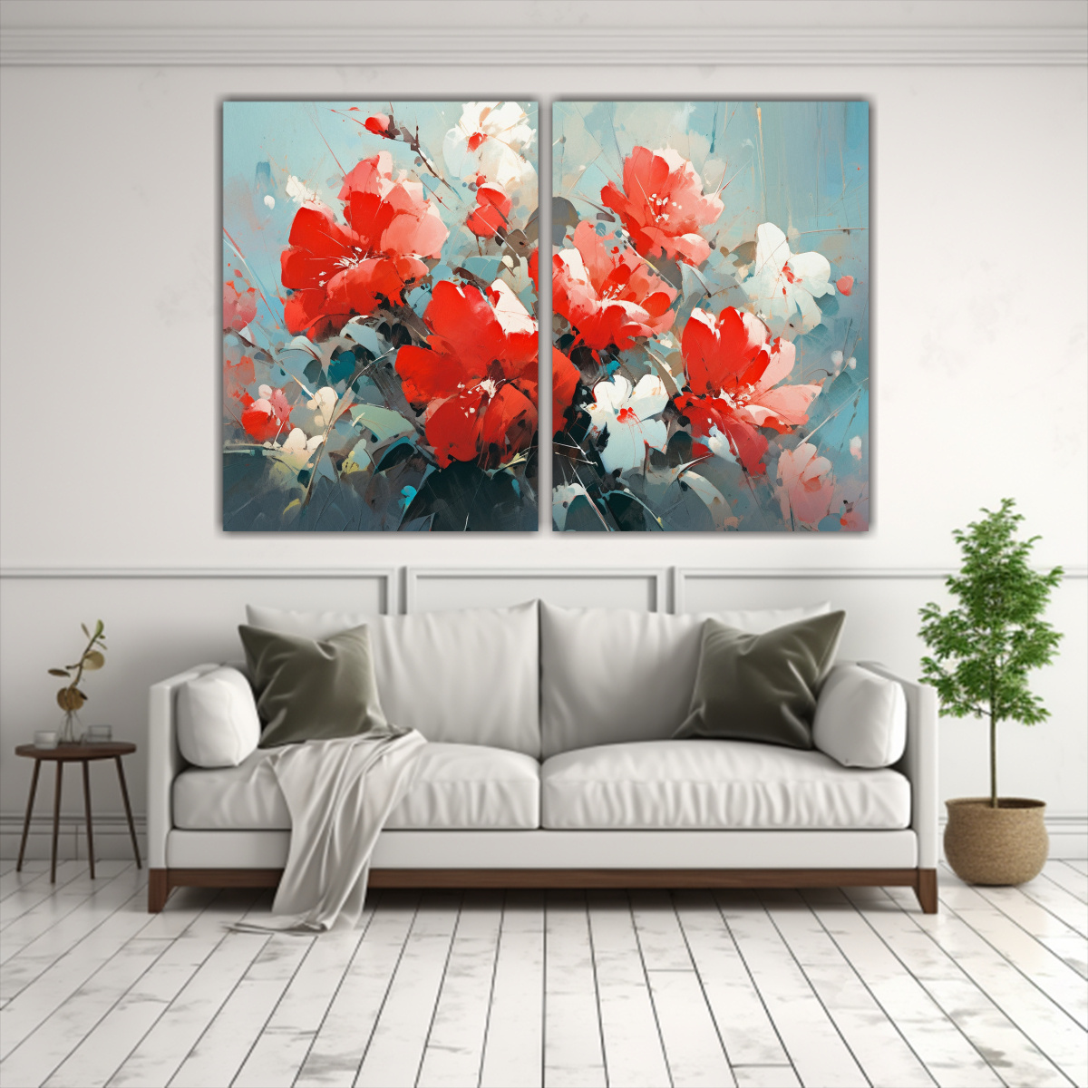 Decora tus espacios con este cuadro en tonos Carmesí y Azul Marino grisaceo, dale vida a tus paredes con flores en lienzo Aprovecha la entrega rápida y gratis en Santiago y envíos express a regiones
