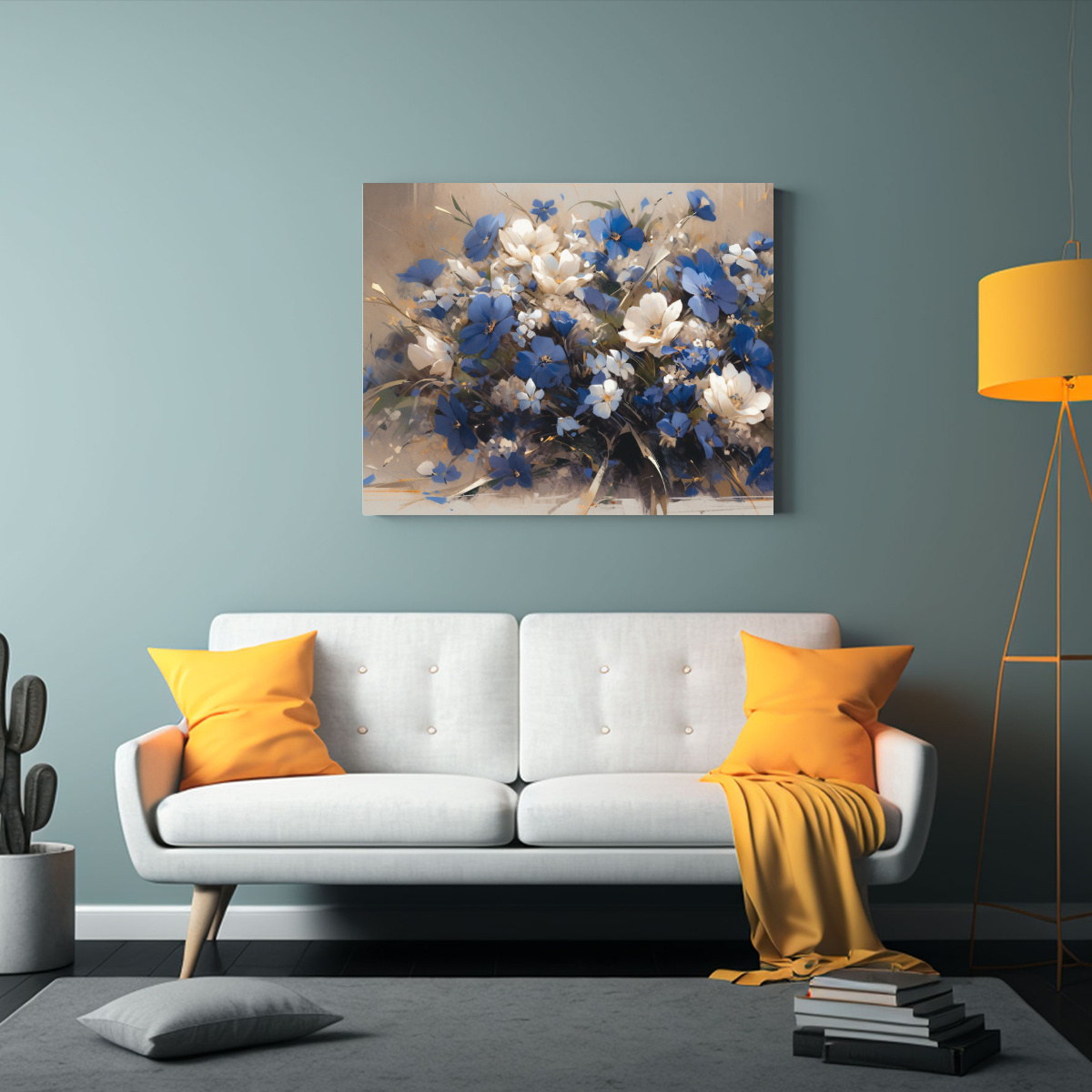 Para realzar la elegancia de tu sala de estar, coloca este Cuadro de Flores Azul y Dorado sobre un sofá de color neutro y complementa con cojines en tonos plateados y turquesa ¡Crearás un ambiente sofisticado y armonioso!