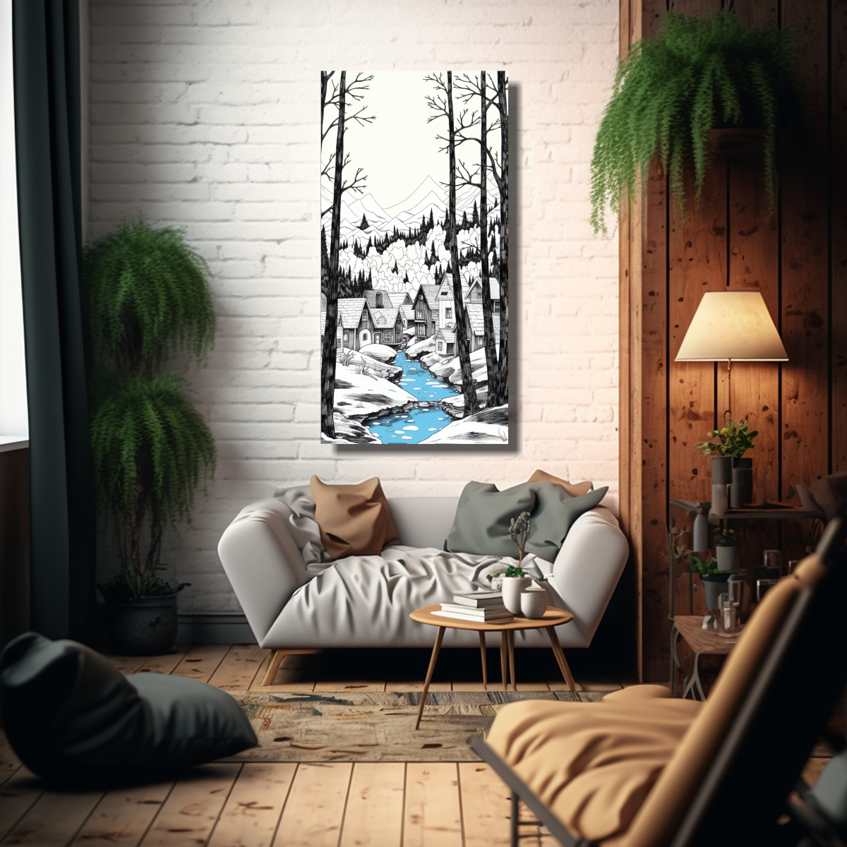 Cuadro Tonos Escena Print Dibujo Línea Bosque Nieve Montaña Riachuelo Bl