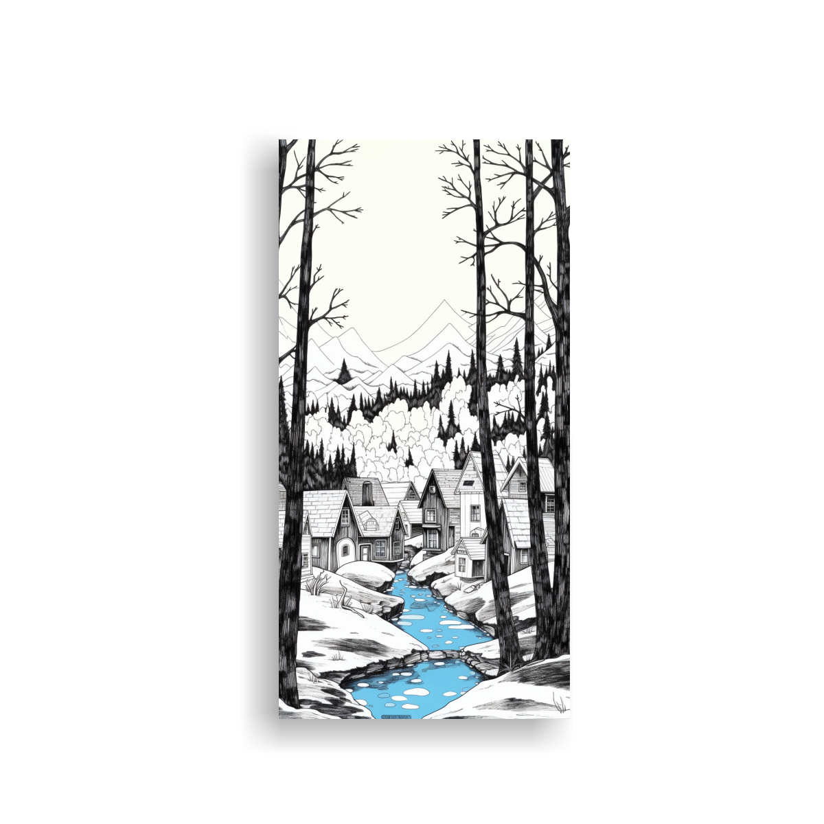 DecoCuadros te ofrece el cuadro Tonos Escena Print dibujo línea bosque nieve montaña riachuelo bl con colores azul marino grisaceo, gris, turquesa, blanco, plateado y menta Confeccionado en tela de alta calidad y bastidores de madera