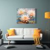 Para realzar la tranquilidad de tu sala de estar, te recomendamos colocar este cuadro de nenúfares frescos sobre un sofá de tonos neutros, como beige o gris, creando un ambiente sereno y sofisticado ¡Haz de tu hogar un lugar único con nuestra selección de arte!