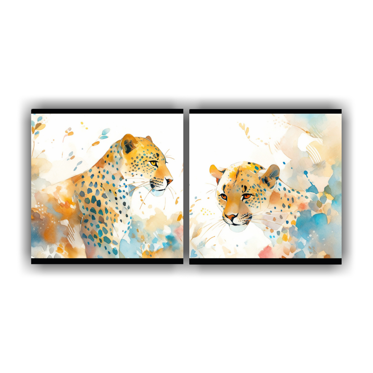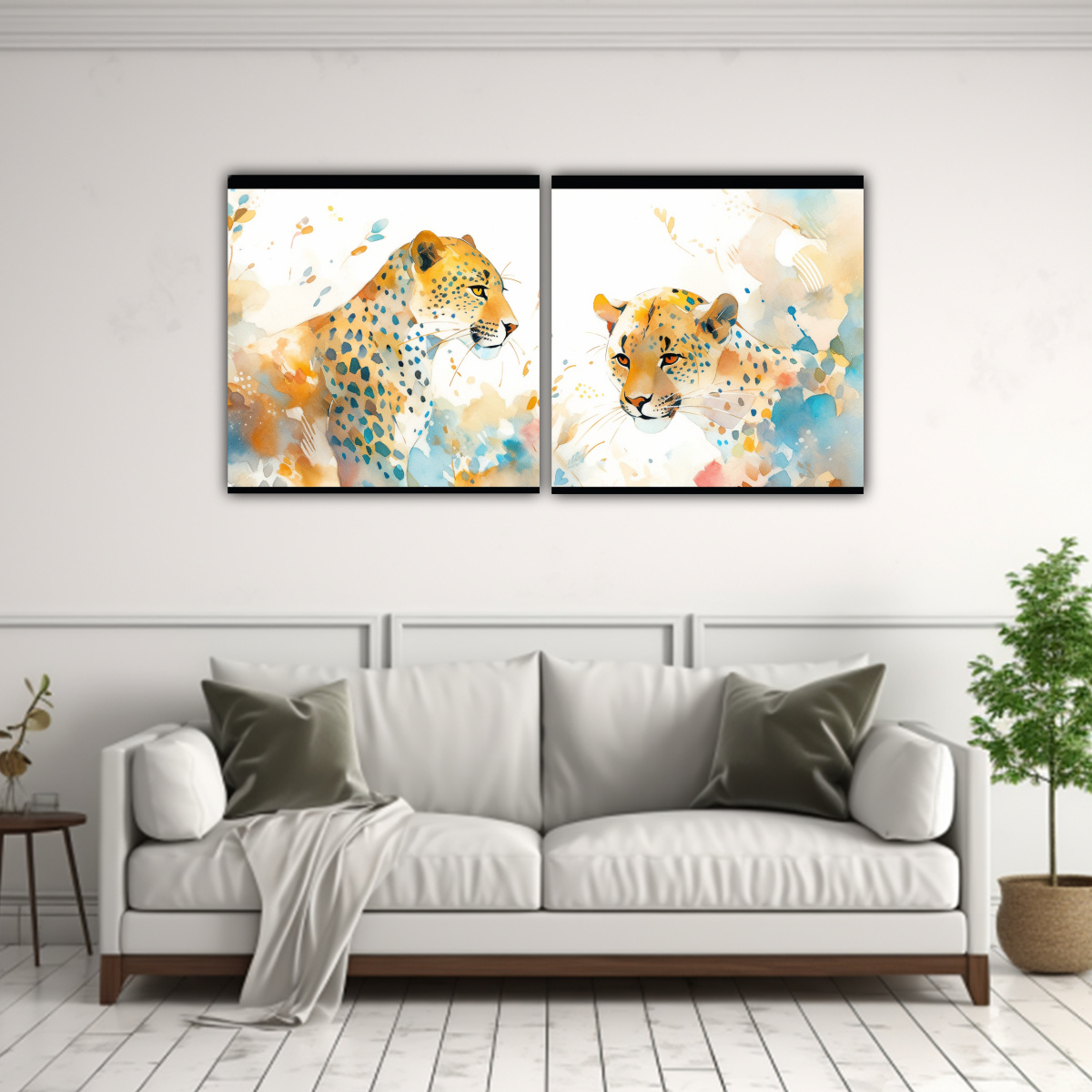 Para lograr un ambiente moderno y sofisticado, coloca este cuadro urbano de leopardos en acuarelas y colores dorados en una pared blanca para que resalte Combínalo con muebles en tonos neutros y accesorios en tonos plateados para un look elegante y actual