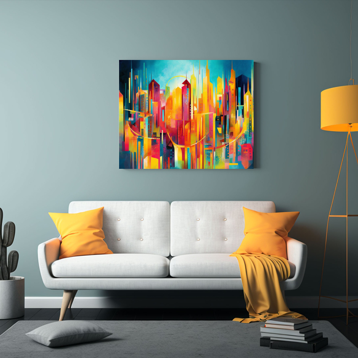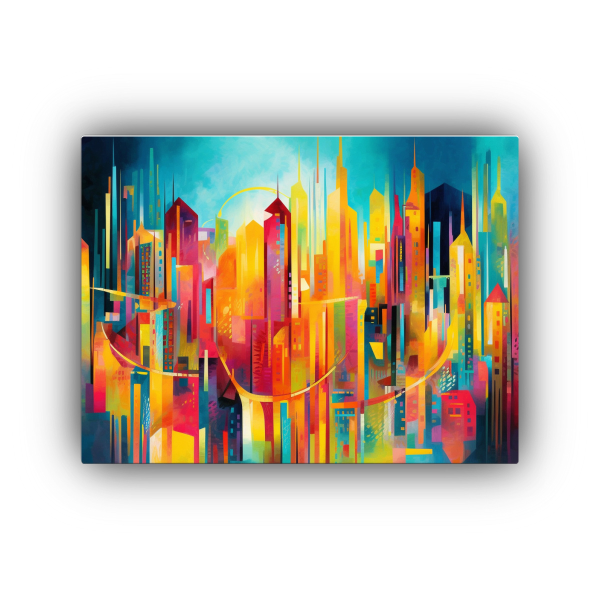 El vibrante paisaje urbano con rascacielos en tonos de coral, dorado y turquesa le dará a tu hogar un toque moderno y sofisticado Adquiere calidad y estilo con nuestros cuadros decorativos exclusivos