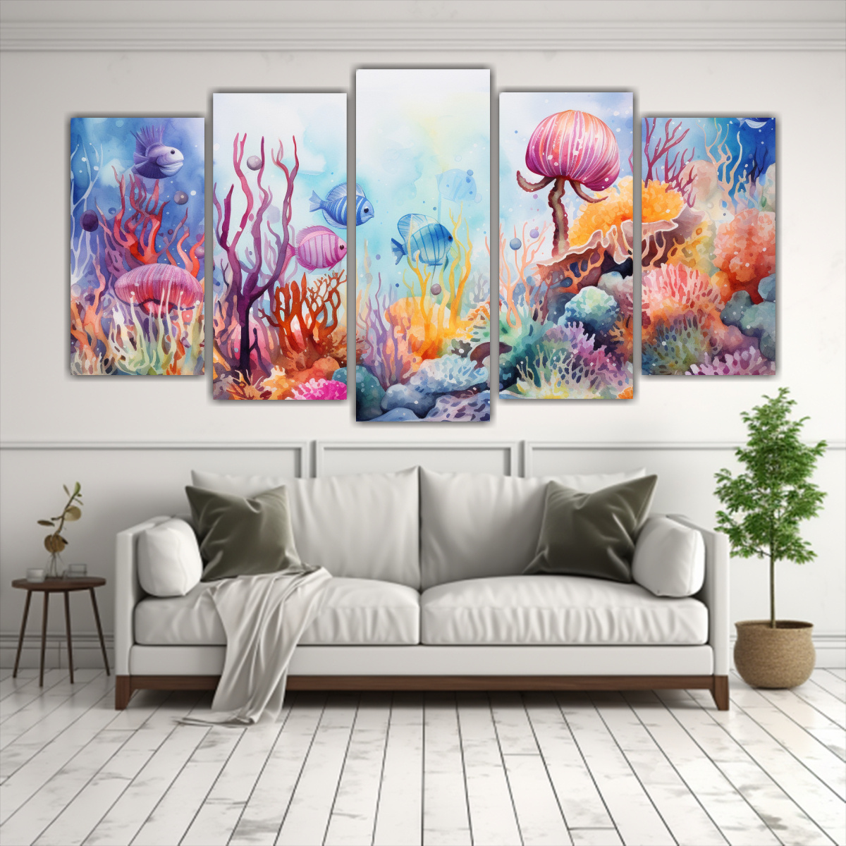 Para realzar la belleza del Cuadro Vanguardia Innovador Vida Marina Acuarela Colorida, te recomiendo colocarlo en la sala de estar sobre un sofá beige o gris claro Complementa con cojines en tonos turquesa y coral para lograr un ambiente armonioso y refrescante