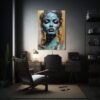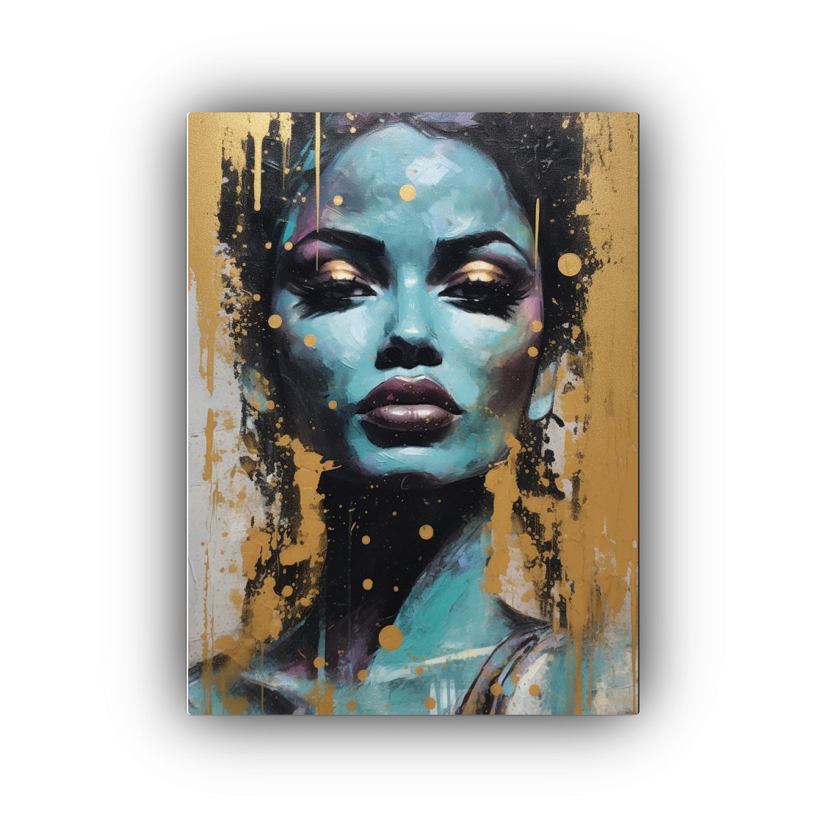 Cuadro Vanguardia Poder Retrato De Mujer Exótica En Un Tono Verdeazulado.