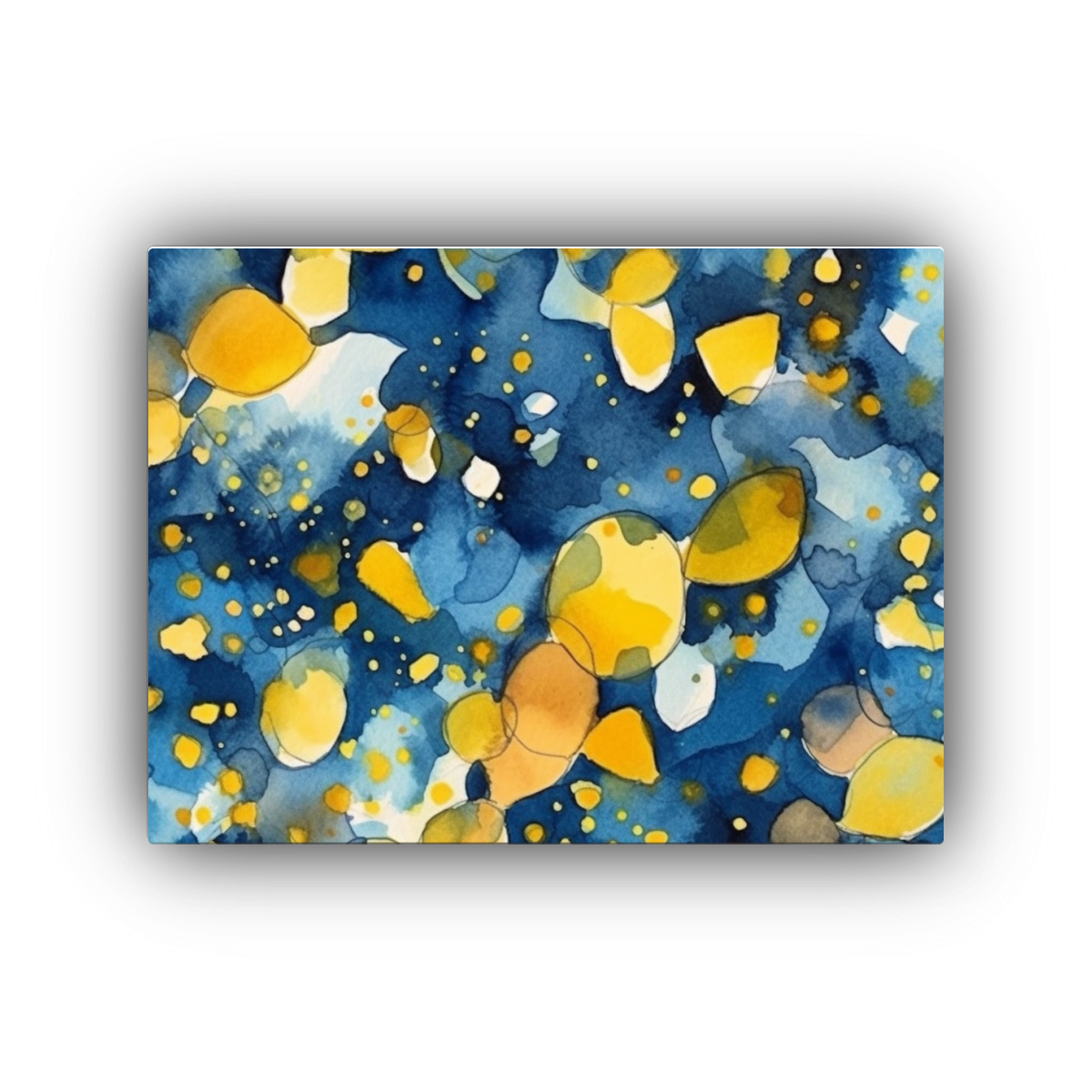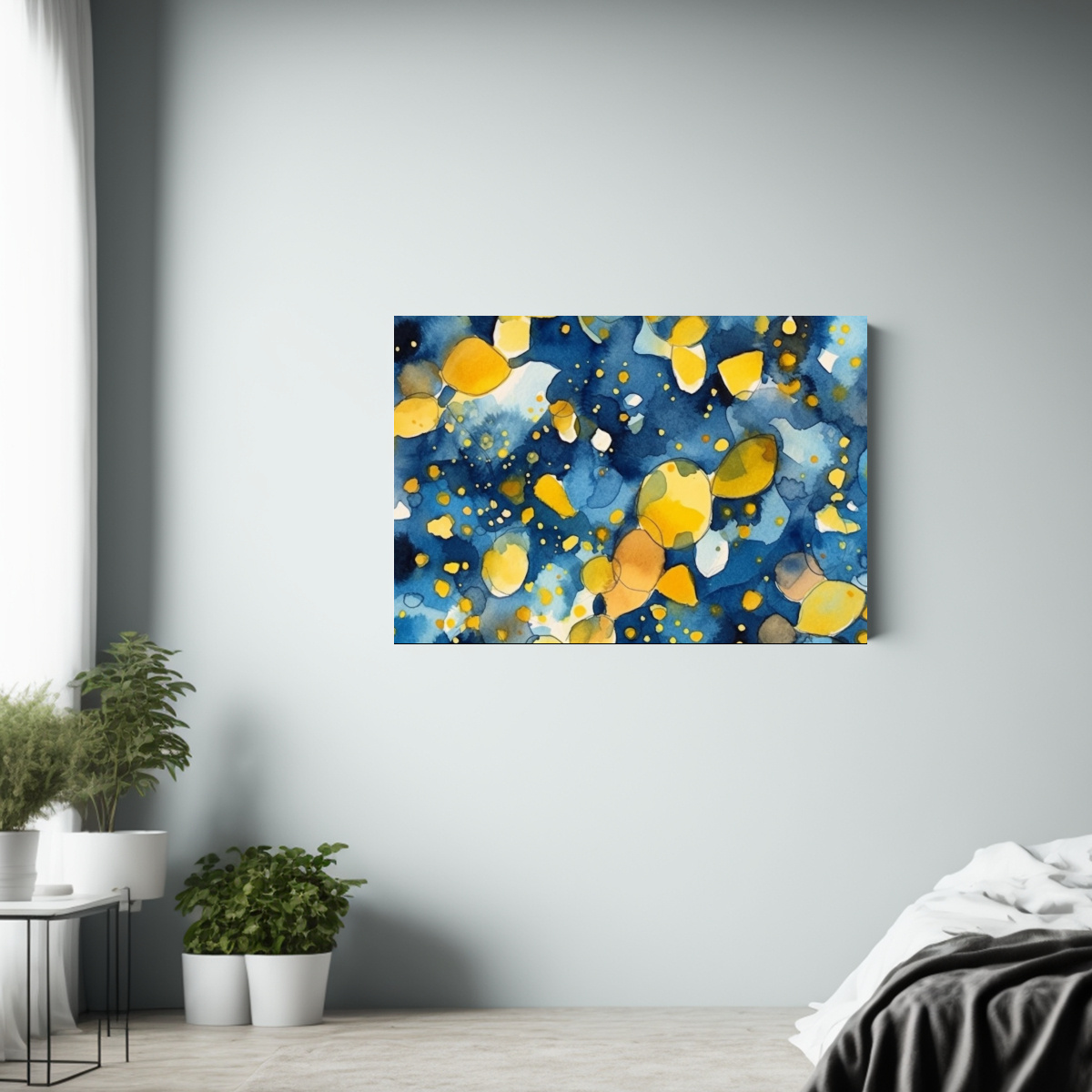 Este cuadro equilibrado en azul y amarillo es perfecto para decorar una sala de estar o un dormitorio, combinando con muebles en tonos neutros para resaltar su estilo preescolar y darle un toque de alegría y creatividad a la habitación