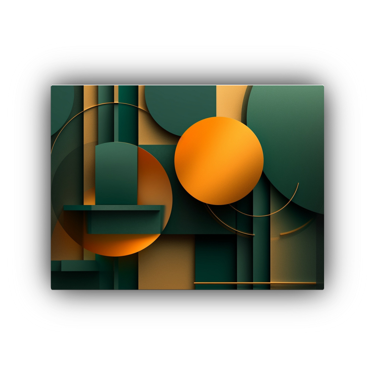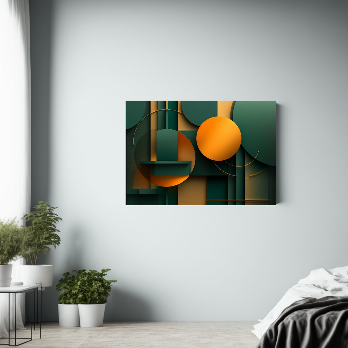 Este cuadro abstracto verde con formas abstractas sería ideal para colocar en el salón junto a muebles blancos y plantas, creando un ambiente fresco y moderno ¡Atrévete a darle un toque único a tu espacio!