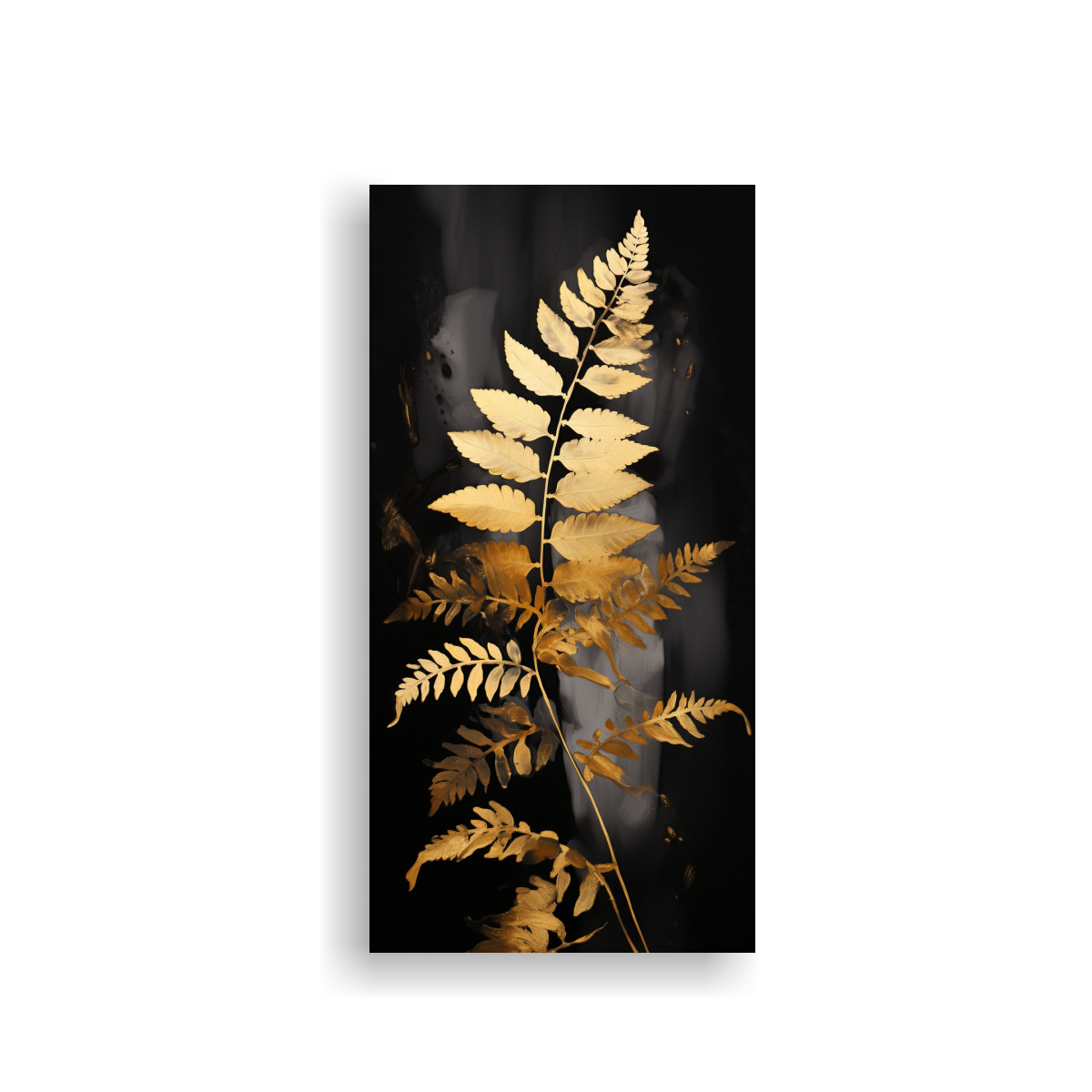 Cuadro Vertical Impacto Visual De Hojas De Helecho En Colores Oro Y Negro Atmosfera Neonoir