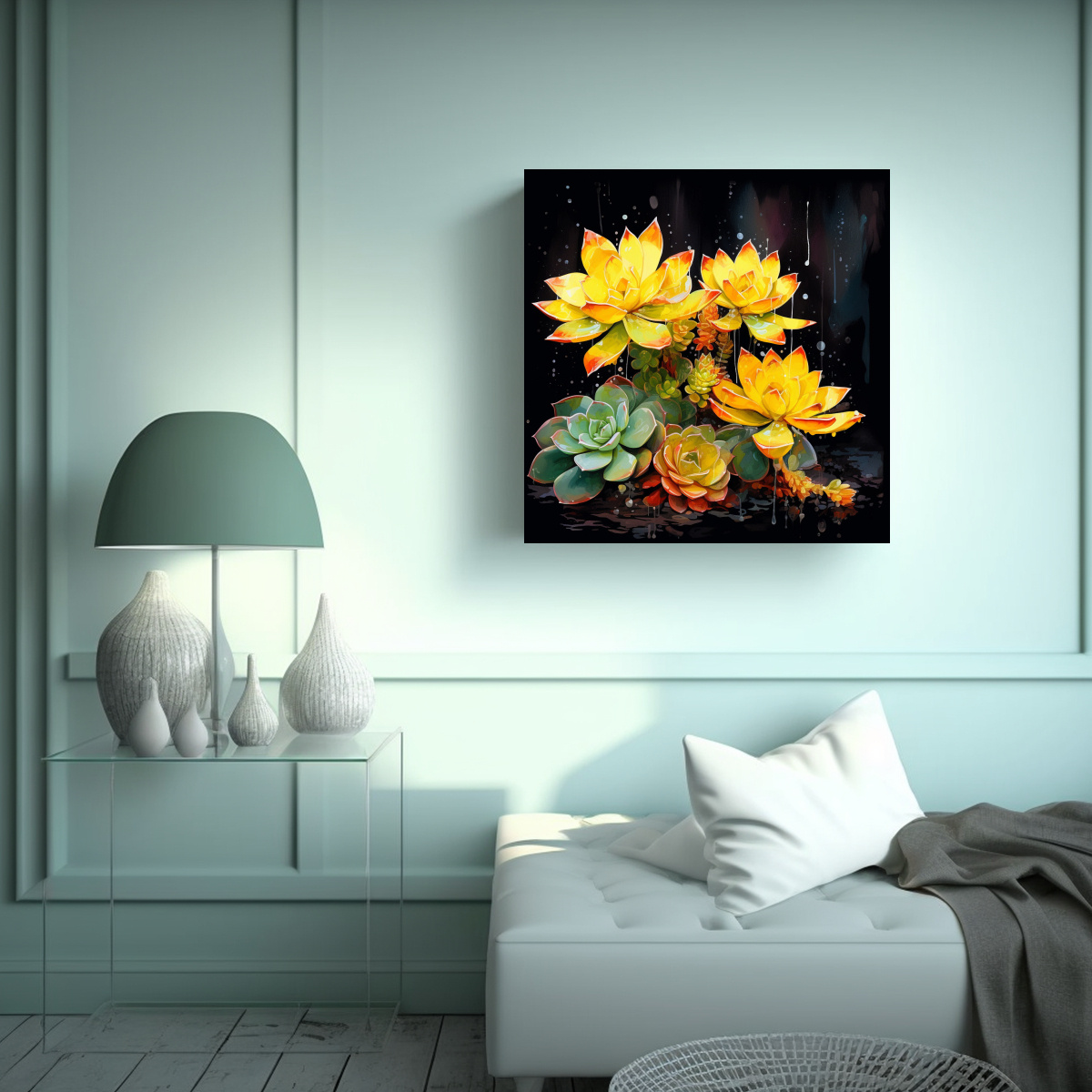 Este cuadro de Vida de Suculentas en Colores Amarillos sería perfecto para decorar tu sala de estar Colócalo encima de un sofá de tonos neutros para resaltar los colores vibrantes del cuadro Completa la decoración con cojines amarillos y plantas suculentas reales para crear un ambiente fresco y acogedor