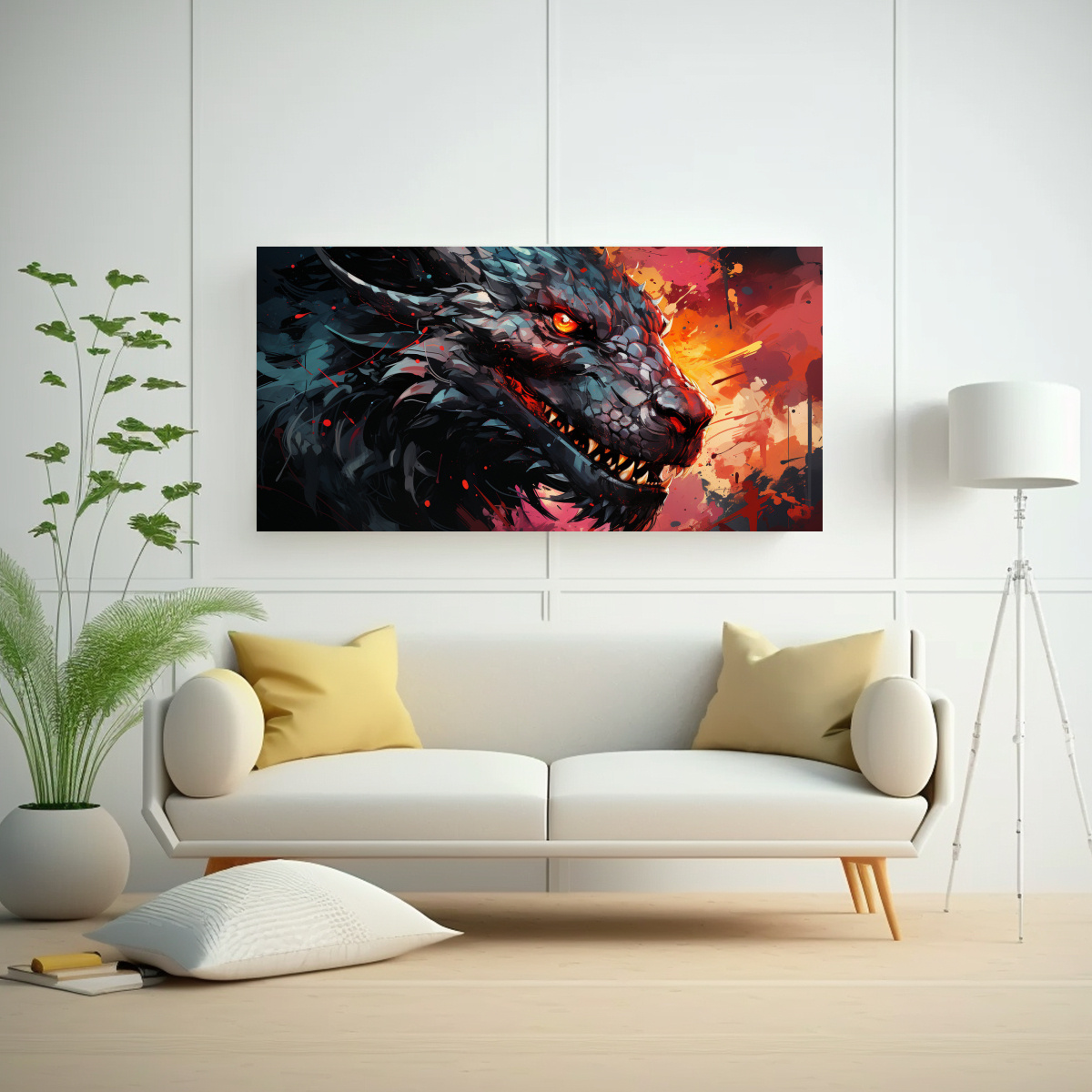 Este Cuadro vintage luminoso con dragón en colores rojo y negro quedaría perfecto en una pared de tonos neutros para resaltar su intensidad Combínalo con muebles de líneas rectas y detalles en plateado para crear un contraste elegante y sofisticado en tu espacio
