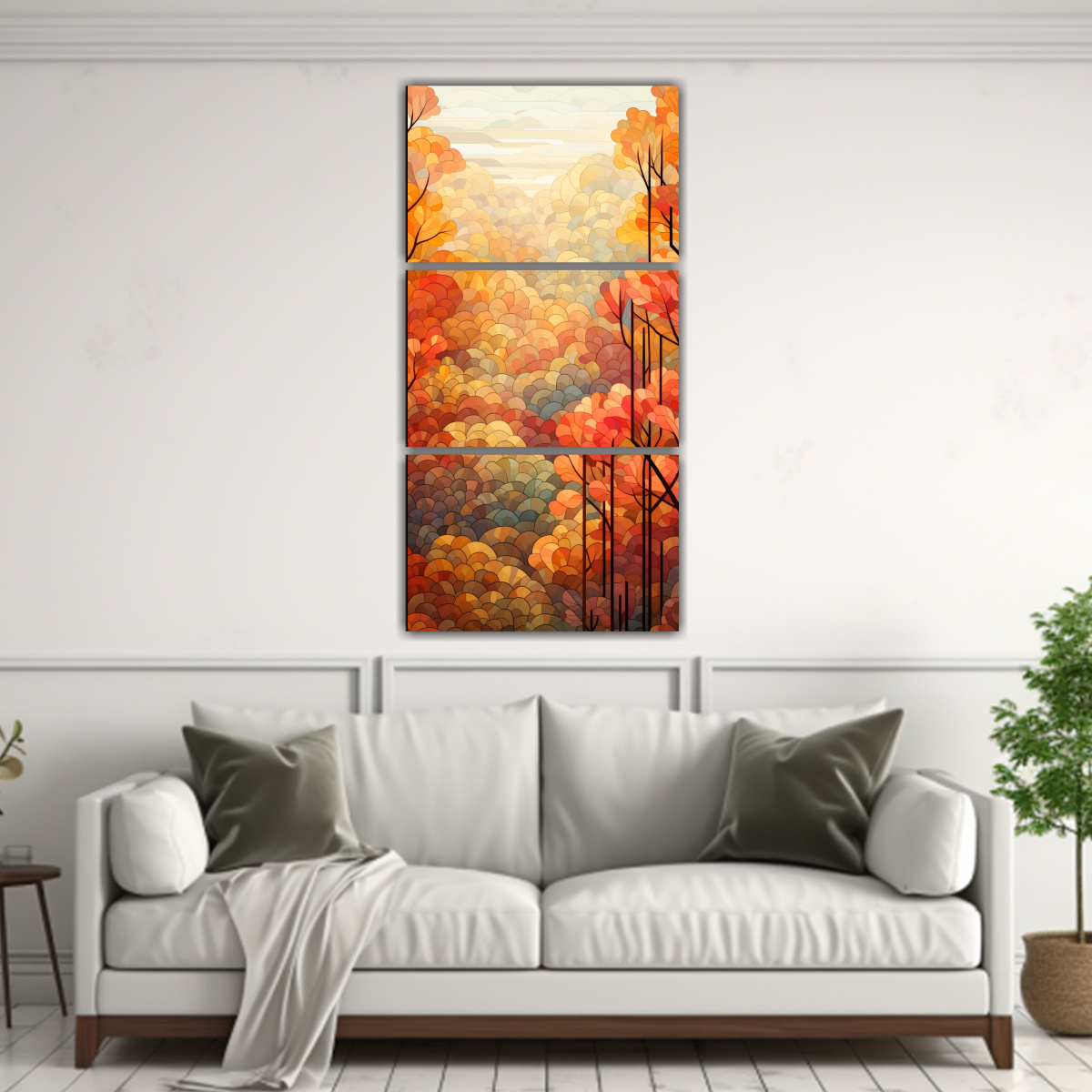 Coloca el Cuadro Otoñal en Bastidor en la pared principal de tu sala de estar para realzar la calidez del ambiente Combina los tonos otoñales con muebles de madera clara y cojines en tonos cálidos para crear un espacio acogedor y elegante