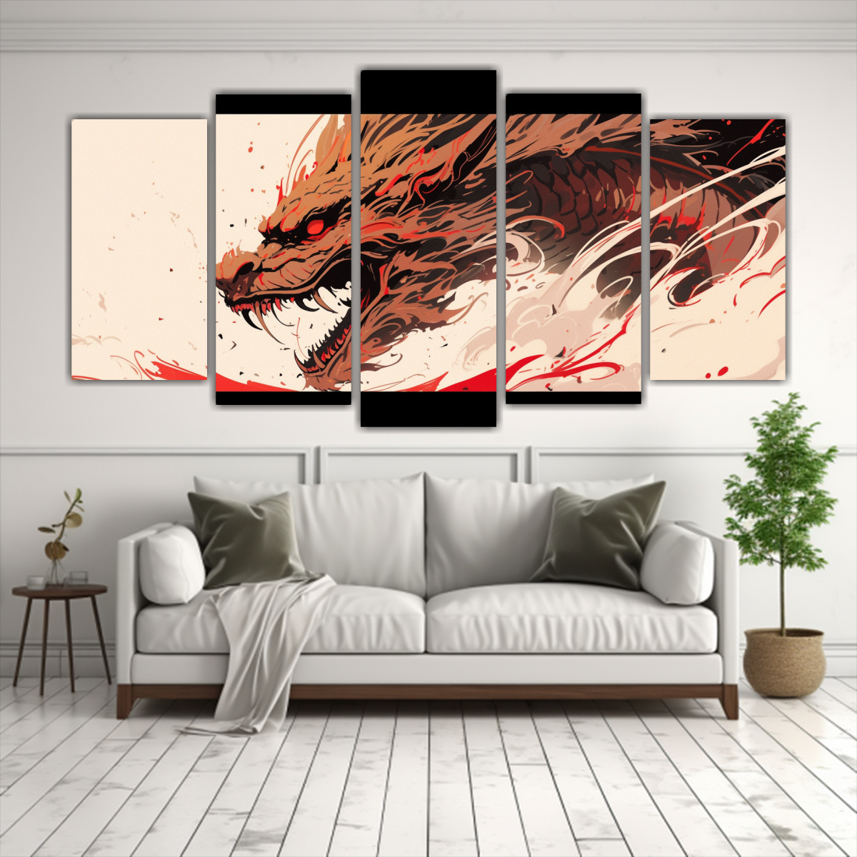 Para realzar la elegancia de tu sala de estar, coloca el Cuadro Abstracción Dragón en Colores Marrón y Rojo sobre un sofá blanco para crear un contraste vibrante Combínalo con cojines en tonos neutros y una alfombra de pelo corto para un ambiente sofisticado y acogedor