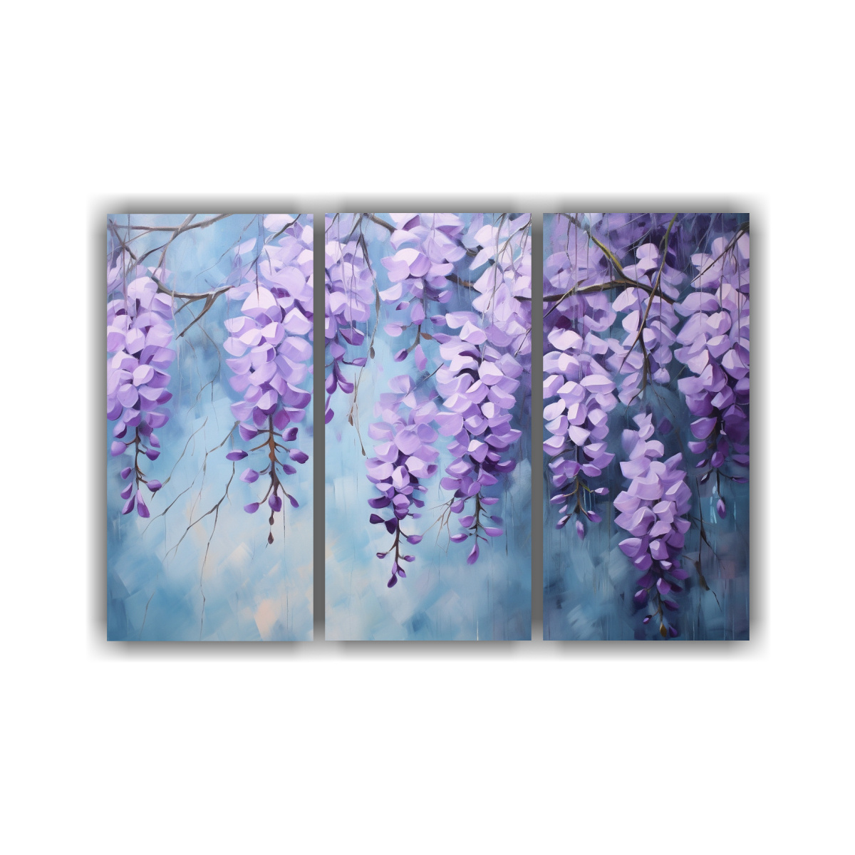 Este conjunto de cuadros abstractos con flores de glicinas en detalle se vería perfecto en una pared de tonos neutros, como blanco o beige, para resaltar los colores vibrantes Colócalos juntos en una fila horizontal para crear un impacto visual o distribúyelos en diferentes alturas para un efecto moderno y elegante