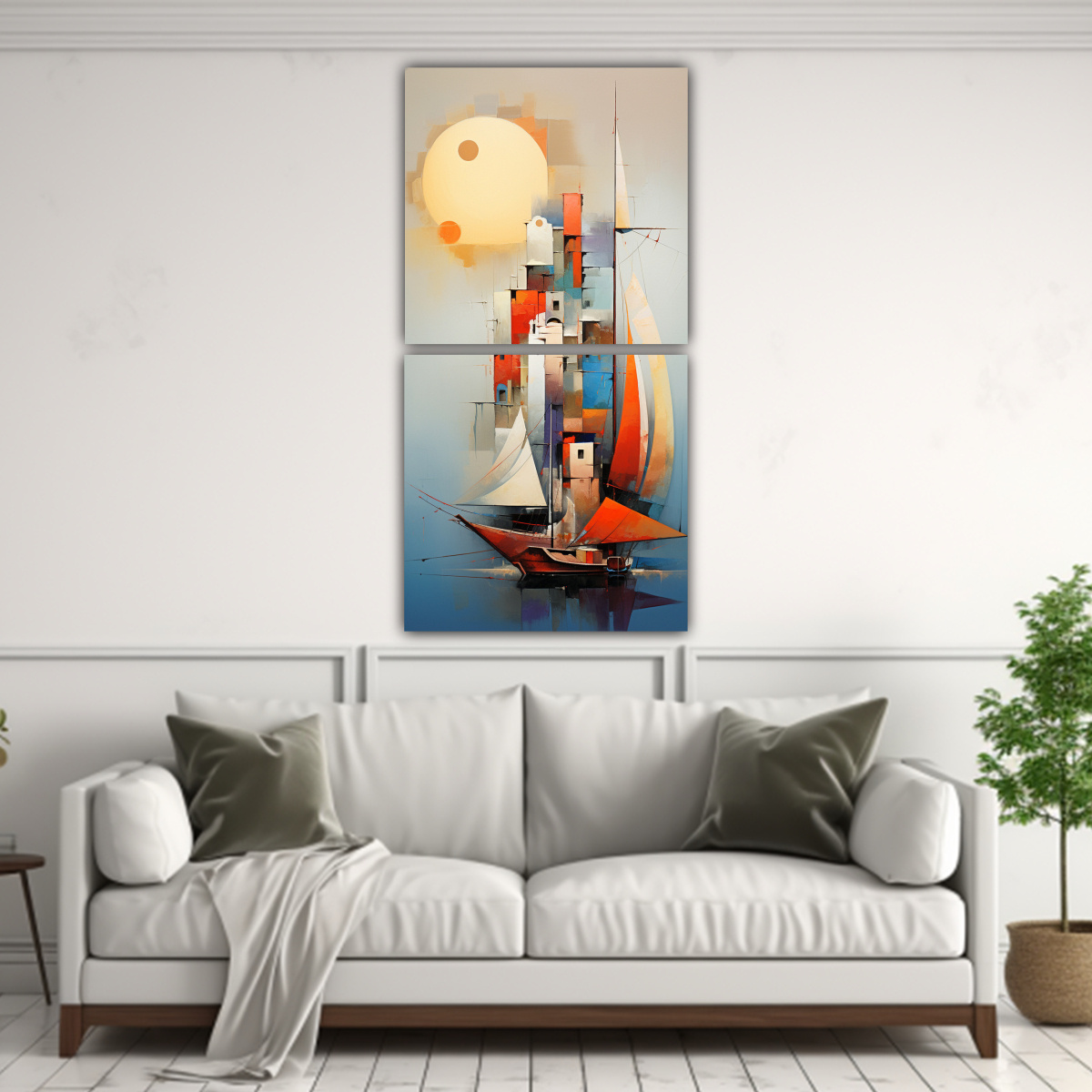 Coloca estos cuadros abstractos de barcos en el comedor para crear un ambiente sofisticado y relajante Puedes colocarlos en una pared vacía junto a una mesa de comedor de estilo contemporáneo y combinarlos con accesorios en tonos neutros como cojines y manteles Elige uno de los colores del cuadro para destacarlo en la decoración, como un jarrón en color coral o un centro de mesa en color turquesa ¡La combinación de colores y el estilo abstracto de los cuadros le darán un toque único a tu comedor!