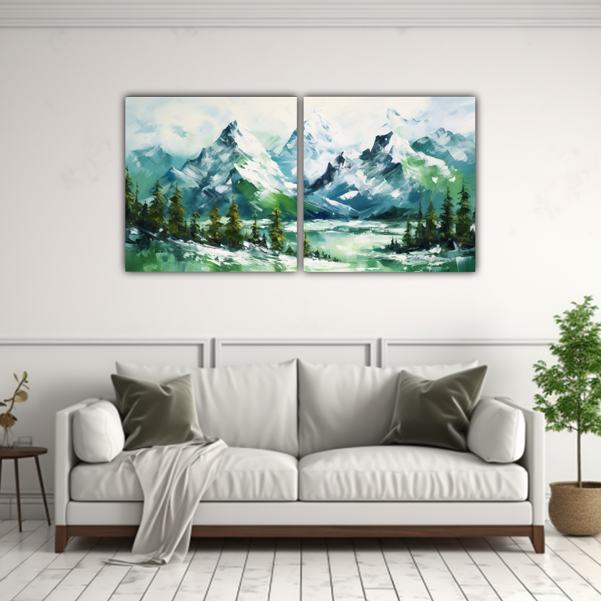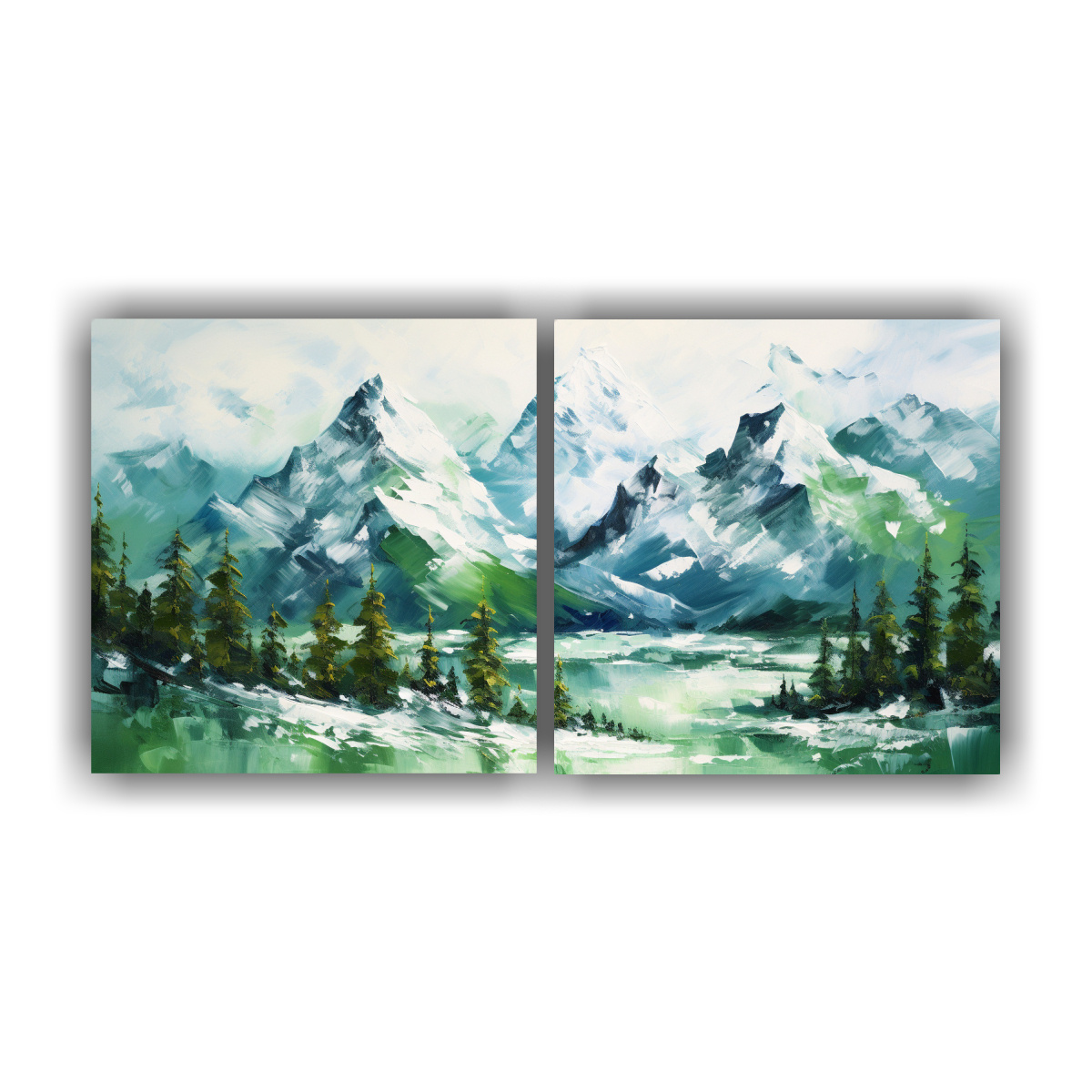 Este cuadro abstracto de montañas nevadas con tonos verdes es ideal para decorar tu comedor, creando un ambiente tranquilo y elegante Colócalo sobre una pared blanca para resaltar su belleza y combinar con muebles de madera clara para un look moderno y acogedor