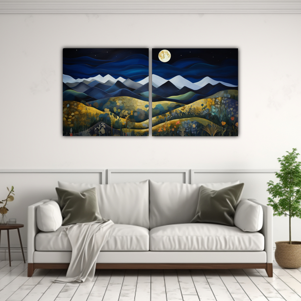 Cuadros Abstractos De Paisaje Nocturno De Montañas Y Árboles En Dos Artes