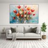 Este cuadro de tulipanes rojos y turquesa sería ideal para decorar tu sala de estar sobre un mueble blanco, creando un contraste elegante y moderno También puedes colocarlo en un pasillo para darle un toque de color y frescura
