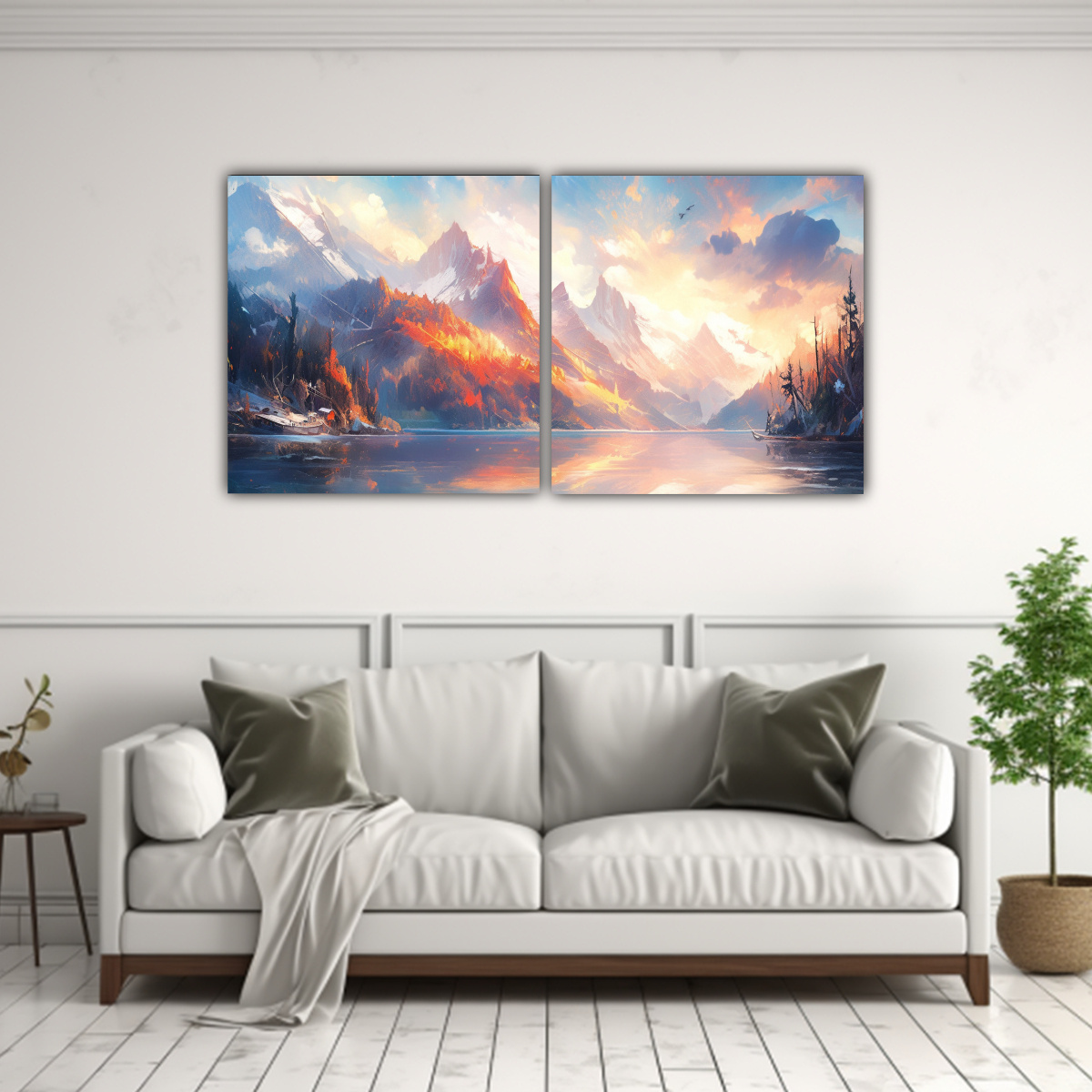 Este cuadro enigmático de montañas junto al lago con colores vibrantes sería perfecto para destacar en la sala de estar sobre un sofá gris Combina con cojines en tonos azules, grises y plateados para lograr un ambiente moderno y elegante