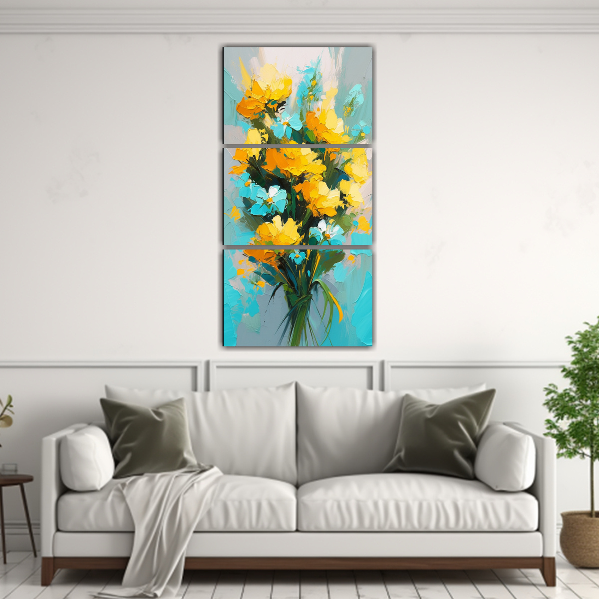 Este cuadro abstracto de flores en tonos amarillo y turquesa es ideal para decorar tu sala de estar o el dormitorio principal Combínalo con muebles en colores neutros como blanco, gris o beige para crear un ambiente moderno y elegante