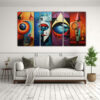 Este cuadro de tres lienzos en colores coral, turquesa, carmesí, azul marino grisáceo, verde azulado y plateado es perfecto para decorar salas de estar o dormitorios modernos Puedes colocarlo sobre un mueble blanco o gris claro para resaltar los tonos vibrantes del cuadro También puedes combinarlo con cojines en colores similares para crear una armonía visual en el espacio ¡Dale un toque de estilo a tu hogar con este cuadro exclusivo de DecoCuadros!