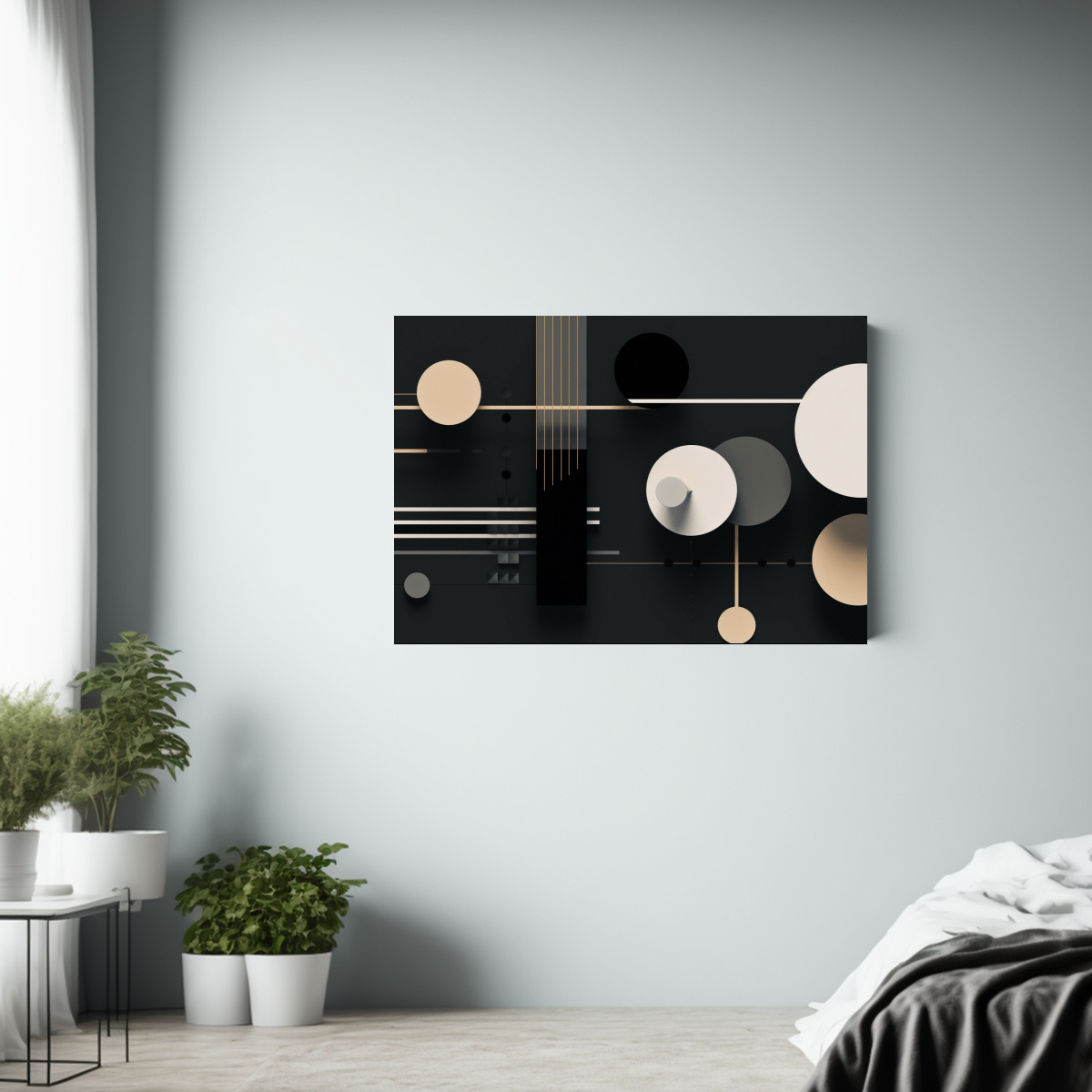 Para resaltar la belleza de este cuadro abstracto minimalista, te recomendamos colocarlo en una pared blanca para que los tonos plateado, negro, azul marino grisáceo y gris resalten aún más Combínalo con muebles modernos en tonos neutros para lograr un ambiente sofisticado y contemporáneo